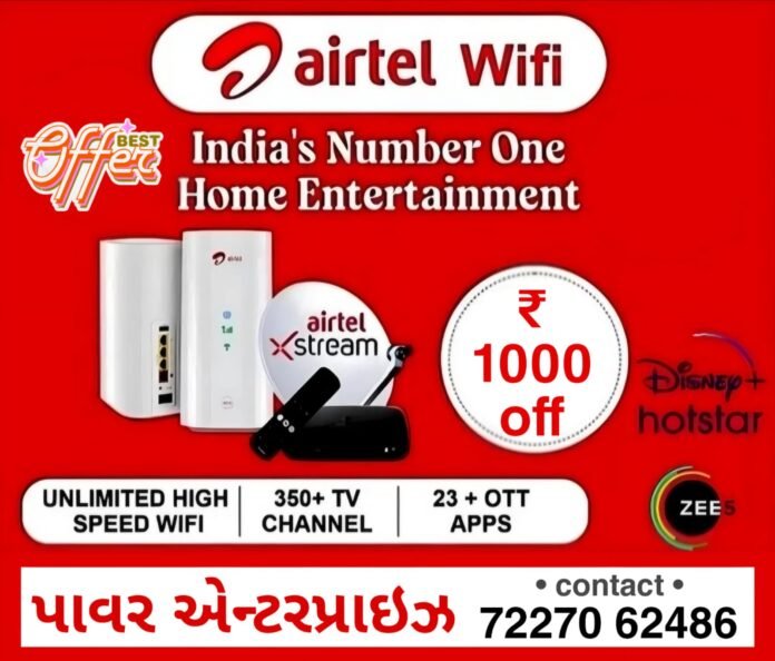 આજકાલના આધુનિક અને ઝડપી સમયમાં ધંધા-રોજગાર સહિત દરેક ક્ષેત્રમાં ઝડપી ઇન્ટરનેટ પ્રાથમિક જરૂરિયાત બની ગયું છે, ત્યારે દેશની નામાંકિત એરટેલ કંપની દ્વારા વાંકાનેર શહેર અને તાલુકામાં કોઈપણ સ્થળે હાઈસ્પીડ ઇન્ટરનેટ માટે વાઇફાઇ ઇન્સ્ટોલેશન પર દિવાળી ધમાકા ઓફર લોન્ચ કરવામાં આવી છે, જેમાં ફક્ત આજે શુક્રવારના દિવસ માટે ગ્રાહકોને ધીમા ઇન્ટરનેટની ઝંઝટમાંથી મુક્તિ સાથે અનલિમિટેડ નેટ + 350 થી વધુ ટીવી ચેનલ સાથે વાઇફાઇ ઇન્સ્ટોલેશન પર રૂ. 1000 નું કેશ ડિસ્કાઉન્ટ આપવામાં આવશે….