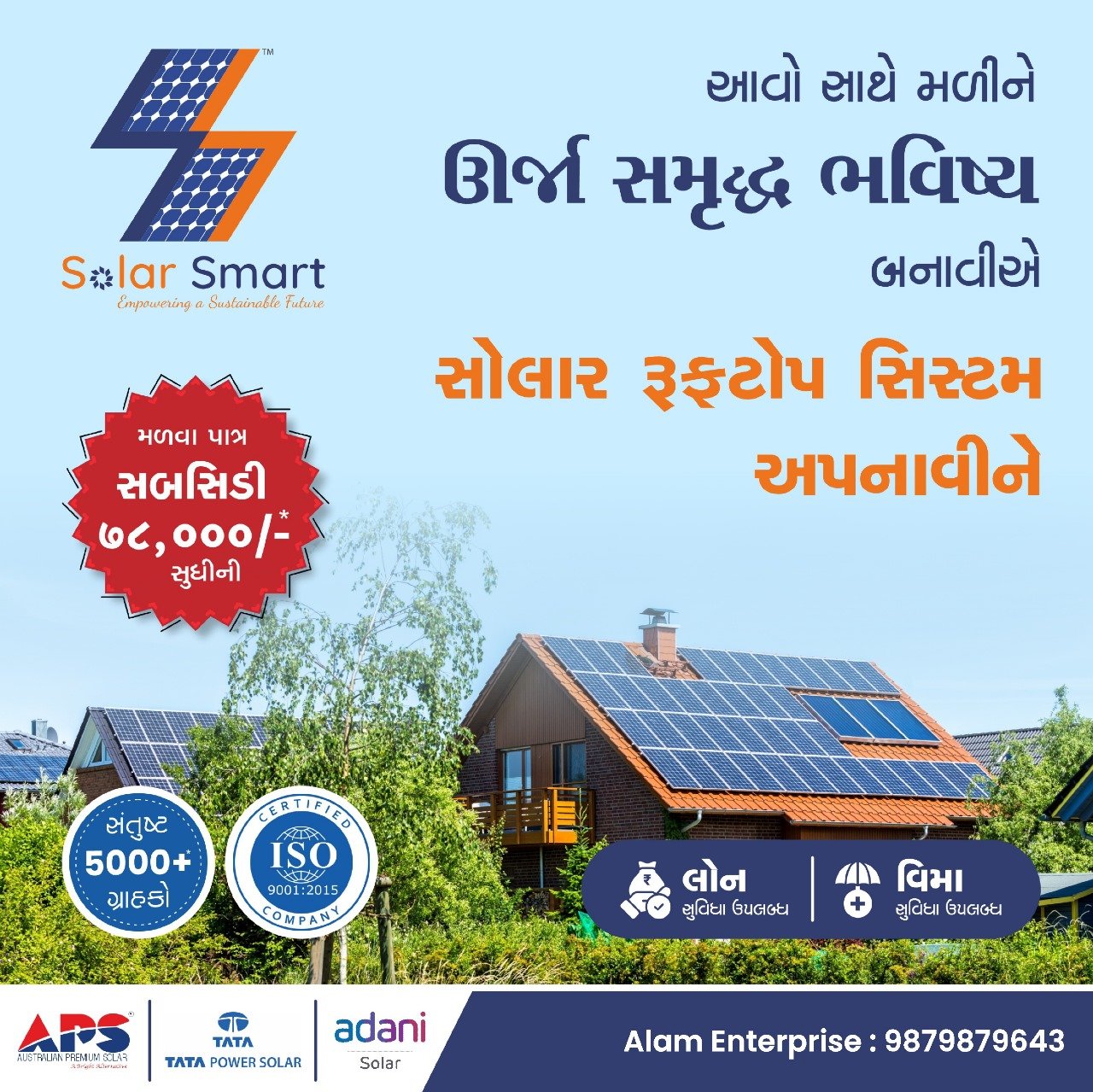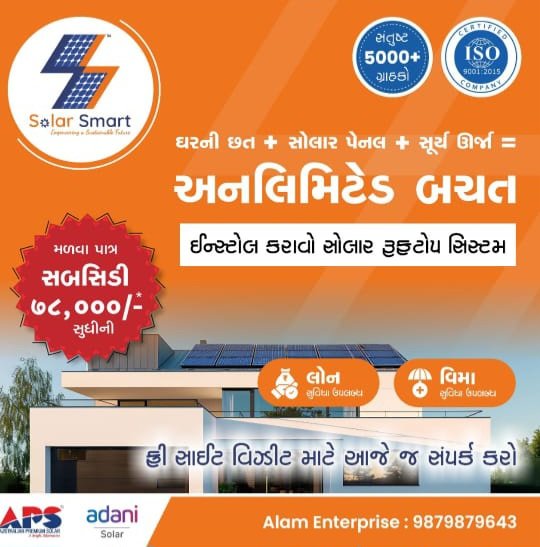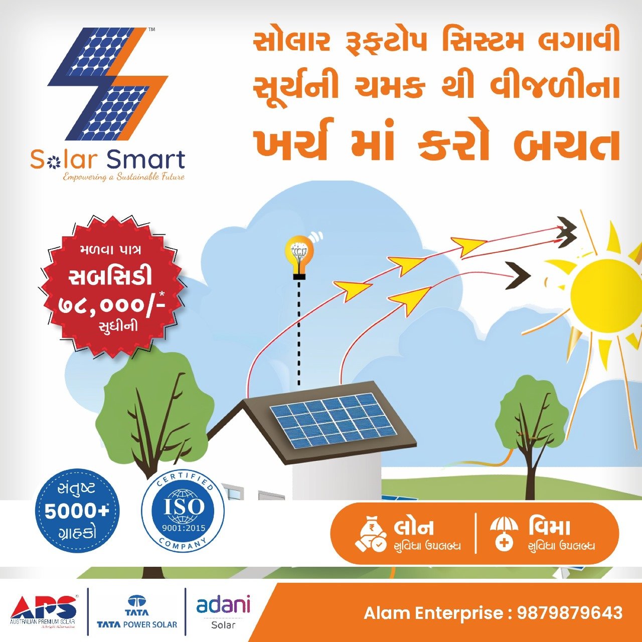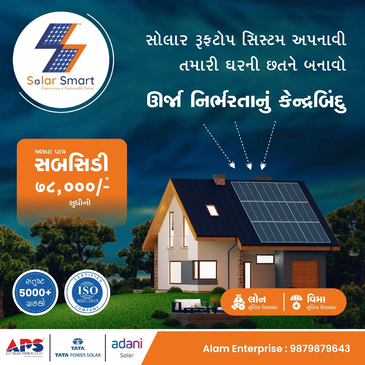 આ સાથે જ ગ્રાહકોને આલમ એન્ટરપ્રાઇઝ ખાતેથી TATA, Adani, Waaree, Rayzone, APS, ONIX સહિત દરેક સોલાર કંપનીના સોલાર રૂફટોપ સિસ્ટમ સૌથી ઓછી કિંમતમાં મળી રહેશે. દરેક સોલાર રૂફટોપના બુકિંગ પર ગ્રાહકોને સૌથી ઓછી કિંમત, 0 ડાઉન પેમેન્ટ તેમજ સબસિડીની રકમ સિધી બાદ મળશે. જેમાં સોલાર સિસ્ટમના ઇન્સ્ટોલેશન બાદ પણ ગ્રાહકોની સોલાર પ્લેટના કોઇપણ પ્રકારના ડેમેજ પર પણ ગેરંટીનો લાભ મળી રહેશે….
