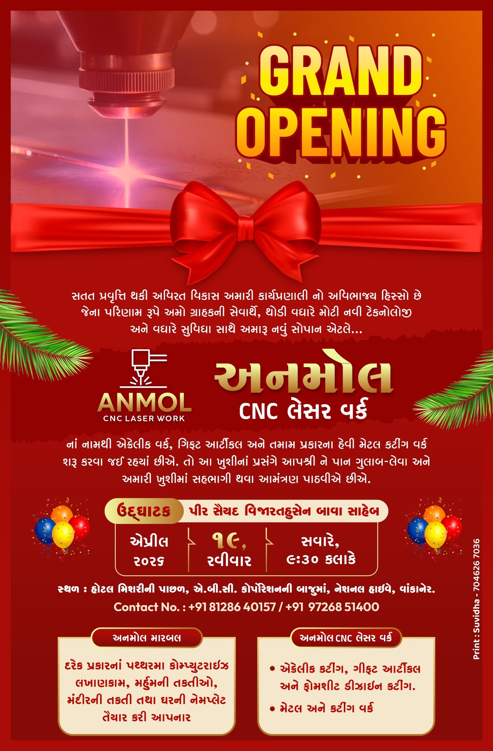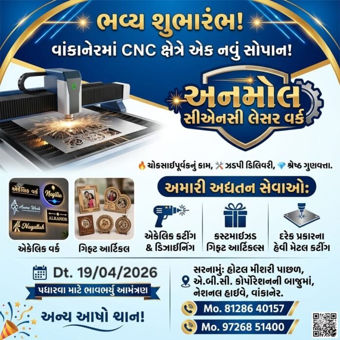 વાંકાનેર શહેર ખાતે CNC અને લેસર કટીંગ ક્ષેત્રે વિશાળ અનુભવ સાથે અનમોલ ગ્રુપ દ્વારા ‘અનમોલ સીએનસી લેસર વર્ક’ ના નવા સોપાનનો આવતીકાલે શાનદાર શુભારંભ થવા જઇ રહ્યો છે, ત્યારે આ અવસરે ઉત્સાહ વધારવા ઉદ્ઘાટન પ્રસંગે ઉપસ્થિત રહેવા તમામ સ્નેહીજનોને ભાવભર્યું આમંત્રણ આપવામાં આવ્યું છે….
