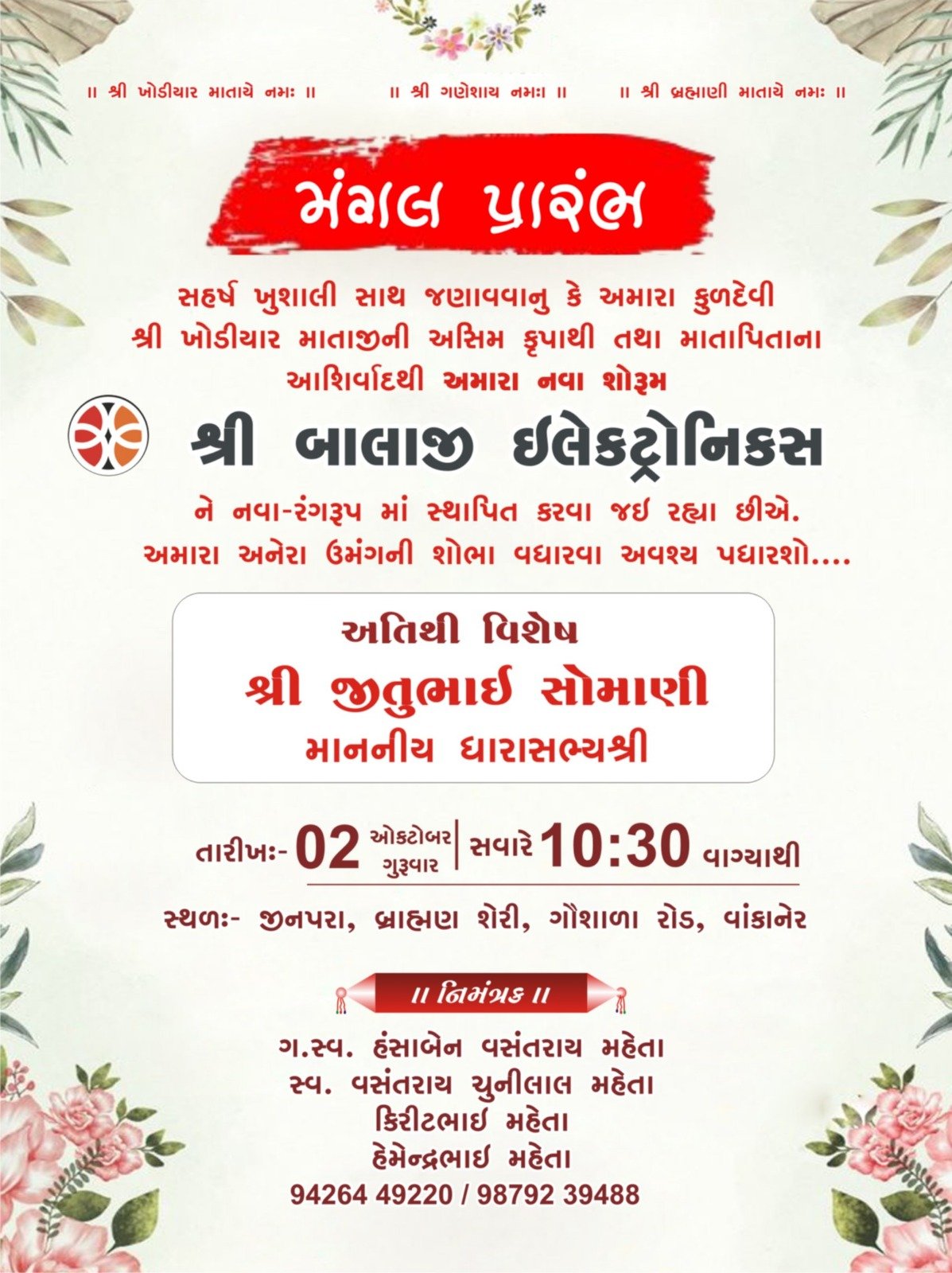 વાંકાનેર શહેર ખાતે છેલ્લા 39 વર્ષથી ગ્રાહકોના વિશ્વાસનું પ્રતીક બની કાર્યરત શ્રી બાલાજી ઇલેક્ટ્રોનિક્સ દ્વારા આધુનિક સમય સાથે કદમ મિલાવી 39 વર્ષના મજબૂત સંબંધોને વધુ સુદ્રઢ બનાવવા ઇલેક્ટ્રોનિક્સના નવા અને વિશાળ શોરૂમનું આવતીકાલ દશેરાના તહેવાર નિમિત્તે ઉદ્ઘાટન કરવા જઈ રહ્યા છે, ત્યારે આ શુભ અવસરે પધારવા તમામ સ્નેહીજનોને ભાવભર્યુ આમંત્રણ આપવામાં આવ્યું છે….