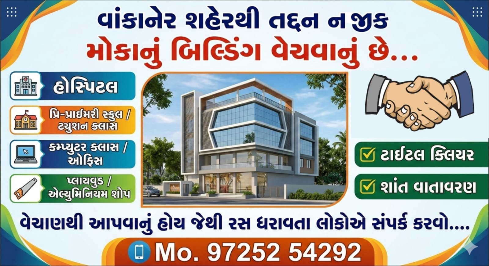 વાંકાનેર શહેરથી તદ્દન નજીક હોસ્પિટલ, પ્રિ-પ્રાઇમરી સ્કુલ, ટ્યુશન ક્લાસ, કમ્પ્યુટર ક્લાસ, તેમજ દરેક પ્રકારની ઓફિસ તથા પ્લાયવુડ, એલ્યુમિનિયમ સેક્શન સહિતના ધંધાકીય / સેવા ક્ષેત્ર માટે ઉપયોગી ટાઈટલ ક્લિયર, શાંત વાતાવરણ વાળું બિલ્ડીંગ વેચાણથી આપવાનું હોય જેથી રસ ધરાવતા લોકોએ નિચે આપેલ નંબર પર સંપર્ક કરવો….
