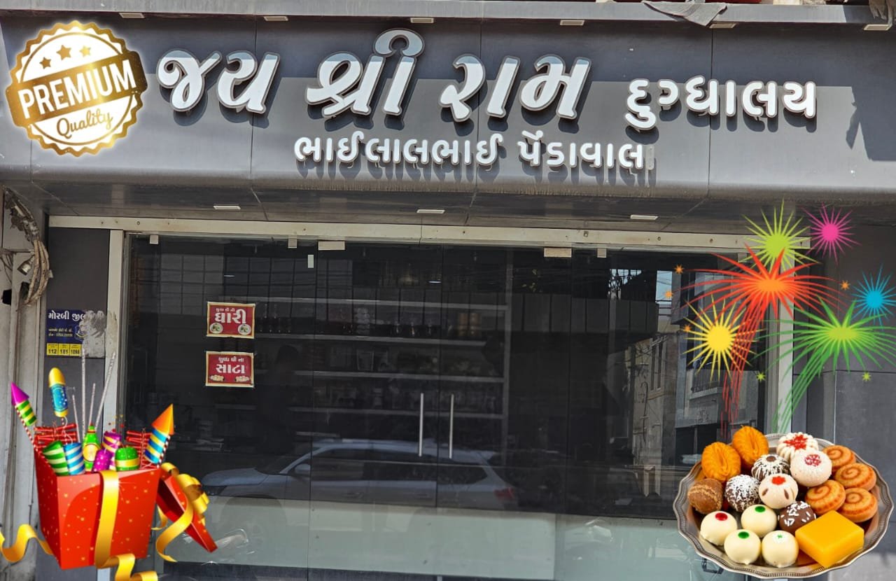 વાંકાનેર પંથકના નાગરિકોને છેલ્લા 55 વર્ષથી બેસ્ટ ક્વોલિટીની સ્વાદિષ્ટ મીઠાઈઓનો સ્વાદ પિરસતા ભાઇલાલભાઇ પેંડાવાલાની જયશ્રી રામ દુગ્ધાલય શોરૂમ ખાતે આ દિવાળી તહેવાર પર ગ્રાહકો માટે સ્પેશ્યલ રેન્જમાં 100 થી વધારે અવનવી સ્વાદિષ્ટ મીઠાઇઓનું વેચાણ કરવામાં આવી રહ્યું છે….
