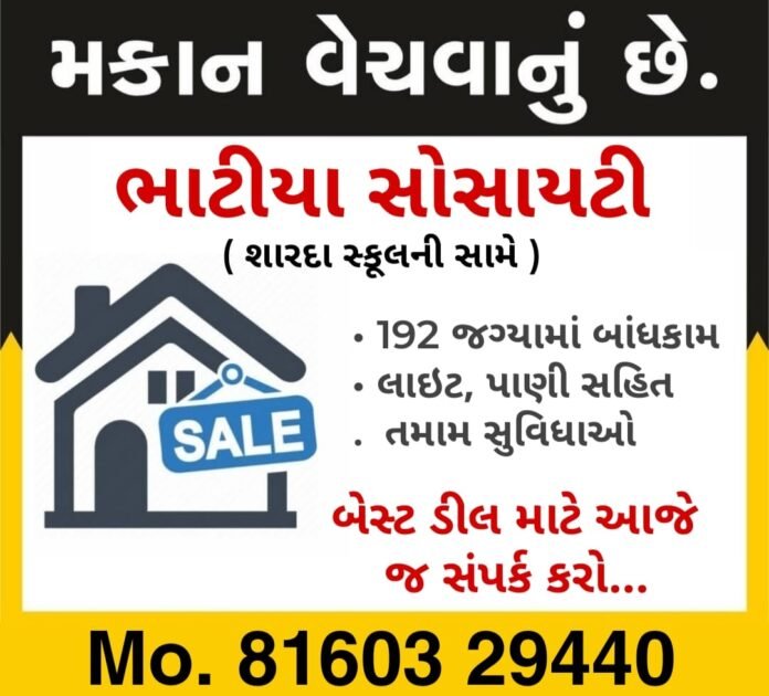 Sign inWelcome! Log into your accountyour usernameyour password Forgot your password? Get helpPassword recoveryRecover your passwordyour email A password will be e-mailed to you. Homeપ્રમોશન આર્ટિકલવાંકાનેર શહેર નજીક ભાટીયા સોસાયટીમાં મોકાની 192 વાર જગ્યામાં બાંધકામ તથા તમામ...પ્રમોશન આર્ટિકલવાંકાનેર શહેર નજીક ભાટીયા સોસાયટીમાં મોકાની 192 વાર જગ્યામાં બાંધકામ તથા તમામ સુવિધાઓ સાથે મોકાનું મકાન વેચવાનું છે….By Yakub BadiAugust 28, 20250ShareFacebookTwitterTelegramWhatsAppCopy URL વાંકાનેર શહેર નજીક ભાટિયા સોસાયટીમાં શારદા સ્કૂલની સામે મોકાની 192 વાર જગ્યામાં એક માળના બાંધકામ સાથે મકાન લાઇટ, પાણી સહિત તમામ સુવિધાઓ સાથે વેચાણથી આપવાનું હોય, જેથી રસ ધરાવતા લોકોએ તાત્કાલિક નીચે આપેલ નંબર પર સંપર્ક કરવો….Mo. 81603 29440ShareFacebookTwitterTelegramWhatsAppCopy URL Previous articleવાંકાનેર પંથકમાં અપમૃત્યુના બે બનાવો : અલગ અલગ બનાવોમાં બે યુવાનોએ ઝેરી દવા ગટગટાવી જીવન ટૂંકાવ્યું…..Next articleશું તમે રોકાણ કરવાનું વિચારી રહ્યા છો ?, વાંકાનેરના ચંદ્રપુર નજીક હાઇવે પર લાઇમર પ્લાઝામાં ઓછાં બજેટમાં શ્રેષ્ઠ રોકાણ માટે દુકાનો ખરીદવા આજે જ સંપર્ક કરો…Yakub BadiRELATED ARTICLES પ્રમોશન આર્ટિકલશિયાળાની કડકડતી ઠંડીમાં મેળવો ગરમાગરમ પાણી…: સૌથી વધુ આયુષ્ય ધરાવતા આલ્ફા કંપનીના મરીન કોટેડ સોલાર વોટર હીટર ચિરાગ ઇલેક્ટ્રિક મોલ ખાતે ઉપલબ્ધ…. November 29, 2025 પ્રમોશન આર્ટિકલJob Vacancy : વાંકાનેર વિસ્તારમાં ફ્લિપકાર્ટ કંપનીના પાર્સલ ડિલિવરી માટે સ્ટાફની ભરતી કરાશે…. November 29, 2025 પ્રમોશન આર્ટિકલઆવતીકાલે વાંકાનેરની લાઇફ મલ્ટી સ્પેશિયાલિટી હોસ્પિટલ ખાતે અમદાવાદના નામાંકિત ચામડી તથા હેર સ્પેશ્યાલિસ્ટ ડોક્ટરની ખાસ ઓપીડી યોજાશે…. November 29, 2025 Most Popularવાંકાનેરના અમરસિંહજી ગ્રાઉન્ડ નજીક રેલ્વેના પાટા પાસે ચાલતી જુગારની મહેફીલમાં પોલીસનો દરોડો…. November 30, 2025 વાંકાનેર સીટી પોલીસમાં નોંધાયેલ અપહરણના ગુનામાં પાંચ મહિનાથી ફરાર આરોપી અમદાવાદથી ઝડપાયો…. November 30, 2025 શિયાળાની કડકડતી ઠંડીમાં મેળવો ગરમાગરમ પાણી…: સૌથી વધુ આયુષ્ય ધરાવતા આલ્ફા કંપનીના મરીન કોટેડ સોલાર વોટર હીટર ચિરાગ ઇલેક્ટ્રિક મોલ ખાતે ઉપલબ્ધ…. November 29, 2025 Job Vacancy : વાંકાનેર વિસ્તારમાં ફ્લિપકાર્ટ કંપનીના પાર્સલ ડિલિવરી માટે સ્ટાફની ભરતી કરાશે…. November 29, 2025 Load moreRecent Comments