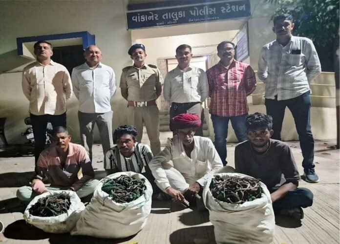 બનાવની ગંભીરતા નોંધતા પોલીસે અજાણ્યા શખ્સો સામે ગુનો નોંધીને તપાસનો ધમધમાટ શરૂ કર્યો હતો. જે બાદ પોલીસે ચોક્કસ ખાનગી બાતમી અને સઘન તપાસના આધારે ચોરીના ગુનાને અંજામ આપનાર આરોપી ૧). વાસુદેવભાઇ રમેશભાઇ દેગામા (ઉ.વ. ૨૩, રહે. મકનસર, મોરબી), ૨). મનજીભાઇ ઉર્ફે શક્તિભાઇ મંગાભાઇ થરેસા (ઉ. વ. ૩૦, રહે. મકનસર, મોરબી), ૩). કનૈયાલાલ મગનાલાલજી રેગર (રહે. હાલે સરતાનપર રોડ, વાંકાનેર) અને ૪). ભેરૂલાલ માંગુલાલ ગુર્જર (ઉ.વ. ૫૫, રહે. ઢુવા ચોકડી, વાંકાનેર)ને ઝડપી પાડી આરોપીઓ પાસેથી ચોરી કરીને બાળી નાખેલ 54 કિલો તાંબાના વાયરના ગુંચળા જપ્ત કરી ધોરણસરની કાર્યવાહી હાથ ધરી છે….