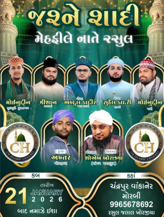 વાંકાનેરના ચંદ્રપુર ગામે આજે રાત્રે CH Islamic Channel પર લાઇવ કવરેજ સાથે મશહૂર મહેફીલ-એ-નાતનો ખાસ પ્રોગ્રામ યોજાશે….
