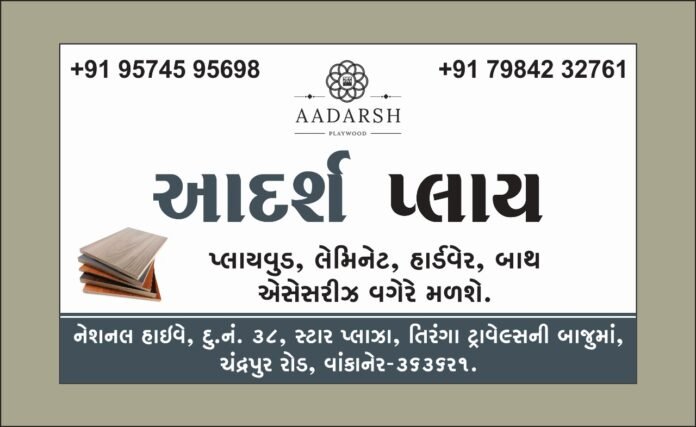 વાંકાનેર શહેર નજીક નેશનલ હાઇવે પર ચંદ્રપુર સર્વિસ રોડ પર સ્ટાર પ્લાઝા ખાતે ટુંક સમયમાં પ્લાયવુડ, લેમીનેટ, હાર્ડવેર તથા બાથ એસેસરી સહિતના વિશાળ શોરૂમ એવા ” આદર્શ પ્લાય ” નો શુભારંભ થવા જઈ રહ્યો છે, ત્યારે અહીંથી ગ્રાહકોને ફર્નિચર તથા હાર્ડવેરને લગતી દરેક આઇટમો એકદમ વ્યાજબી દરેથી મળી રહેશે….