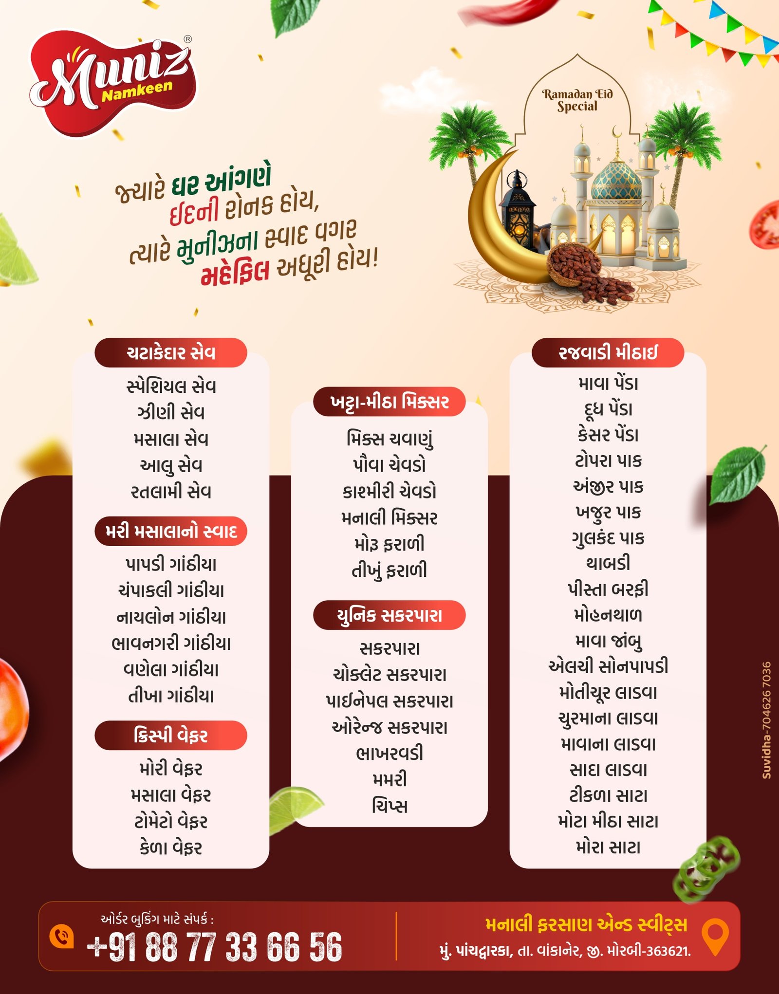 છેલ્લા 20 વર્ષથી વાંકાનેર વિસ્તારના ગ્રાહકોને ક્વોલિટી સાથે સંબંધોમાં મીઠાશનો ફેલાવો કરતા મનાલી ફરસાણ & સ્વીટ દ્વારા આગામી રમઝાન ઇદના પવિત્ર તહેવાર નિમિત્તે મુસ્લિમ બિરાદરો માટે ખાસ વ્યવસ્થા કરવામાં આવી છે, જેમાં ઇદના તહેવાર નિમિત્તે સમગ્ર ગુજરાતમાં ફેલાવો ધરાવતી પોતાની વિશ્વસનીય બ્રાન્ડ “મુનિઝ” ની 100% શુદ્ધતાની ગેરંટી સાથે વિવિધ ફરસાણ આઈટમો તેમજ તહેવારને અનુરૂપ સ્વાદિષ્ટ મીઠાઈઓનું વેચાણ શરૂ કરવામાં આવ્યું છે….