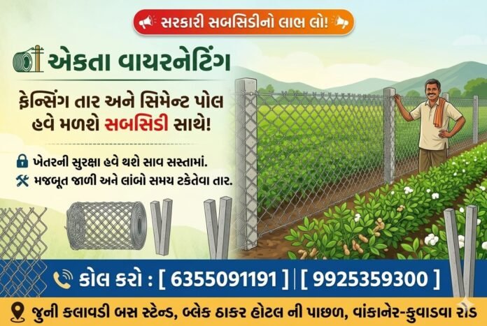વાંકાનેર તાલુકાના કલાવડી ગામના બોર્ડ પાસે સિમેન્ટના થાંભલા તેમજ ખેતર માટે ફેન્સીંગ તારના ઉત્પાદક એવા એકતા વાયર નેટીંગ ઇન્ડસ્ટ્રીઝ દ્વારા ખેડૂતોના ખેતરમાં દરેક પ્રકારના ફેન્સિંગ માટે ગુજરાત સરકારની સબસિડી યોજનાના સંપૂર્ણ માર્ગદર્શન સાથે ખેડૂતોને ઓનલાઈન ફોર્મ ભરવામાં મદદ કરવામાં આવશે….