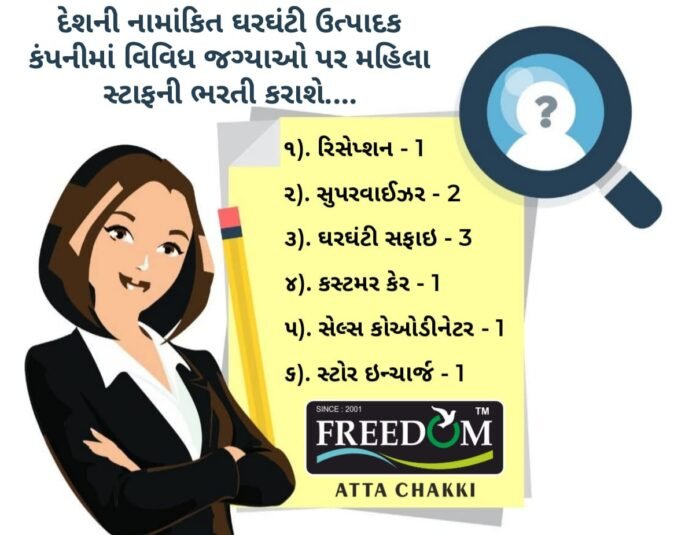 વાંકાનેર-કુવાડવા રોડ પર જીયાણા નજીક આવેલ દેશની નામાંકિત પ્રથમ હરોળની ઘરઘંટી ઉત્પાદક કંપની એફ.એમ. ઇન્ડસ્ટ્રીઝ ખાતે તાત્કાલિક ધોરણે ઉચ્ચતમ પગારધોરણ સાથે વિવિધ જગ્યાઓ પર મહિલા સ્ટાફની ભરતી કરવાની હોય, જેથી નિચે આપેલ જગ્યાઓ માટે યોગ્ય લાયકાત ધરાવતા ઉમેદવારો તાત્કાલિક નીચે આપેલ નંબર પર સંપર્ક કરવો….