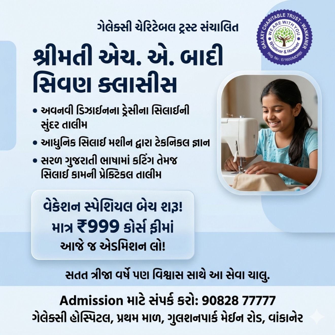 આ સાથે જ શ્રીમતી એચ. એ. બાદી શિવણ ક્લાસીસ શરૂ કરવામાં આવશે, જેમાં મહિલાઓને સ્વનિર્ભર બનાવવા માટે ફક્ત રૂ. 999 ની ફી સાથે આધુનિક સિલાઈ મશીન દ્વારા ટેકનીકલ જ્ઞાન તથા સરળ ગુજરાતી ભાષામાં કટીંગ તેમજ સિલાઈ કામની પ્રેક્ટીકલ તાલીમ તથા અવનવી ડિઝાઇનના ડ્રેસીસના સિલાઈની સુંદર તાલીમ આપવાનું આયોજન કરવામાં આવ્યું છે. સિવણ ક્લાસ પૂર્ણ કર્યા બાદ માન્ય સર્ટિફિકેટ આપવામાં આવશે, જે સરકારશ્રીની વિવિધ સ્વરોજગાર યોજનામાં અને વિવિધ ક્ષેત્રોમાં રોજગારની તકો માટે પણ ખુબજ ઉપયોગી બનશે…