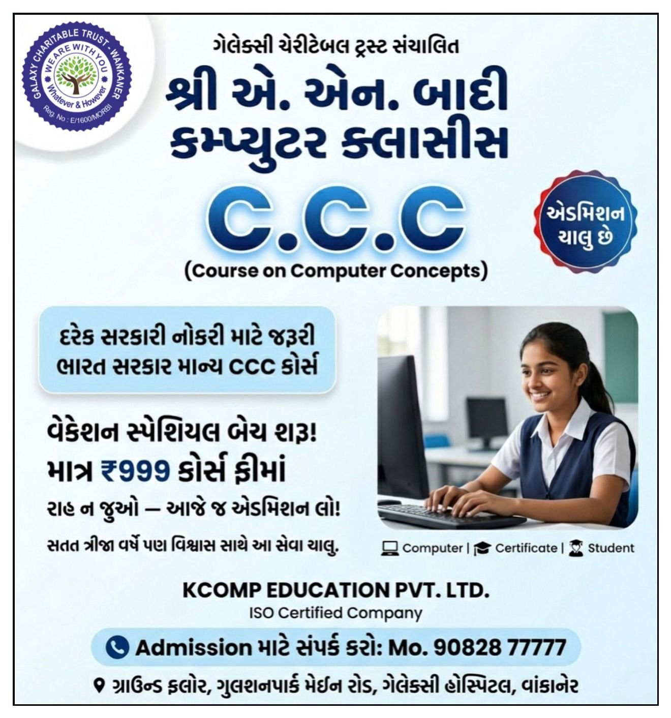 વાંકાનેર શહેર ખાતે ગેલેક્સી ચેરીટેબલ ટસ્ટ દ્વારા વર્તમાન ઉનાળું વેકેશન દરમ્યાન વિદ્યાર્થીઓ અને મહિલાઓ માટે રાહત દરે તાલીમ વર્ગો શરૂ કરવામાં આવ્યા છે, જે અંતર્ગત ખાસ વિદ્યાર્થીઓ માટે શ્રી એ. એન. બાદી કોમ્પ્યુટર ક્લાસિસમાં ફક્ત રૂ. 999 માં કોમ્પ્યુટર કોર્સ કરાવવામાં આવશે, જેમાં કોર્સ પૂર્ણ થઈએ CCCનું સરકાર માન્યતા પ્રાપ્ત સર્ટીફિકેટ આપવામાં આવશે…