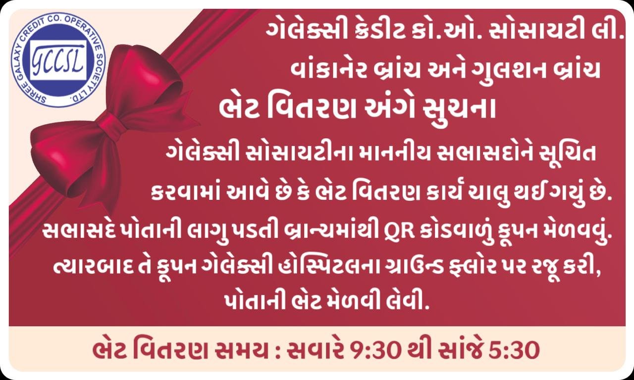 વાંકાનેરની ગેલેક્સી ક્રેડિટ કો. ઓ. સોસાયટી લી.ના સભાસદોને ભેટ વિતરણ અંગે સુચના….