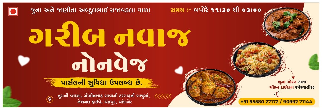 આ સાથે જ રાત્રીના સમયે રાજાવડલા ગામ ખાતે પણ ગ્રાહકોને રાબેતા મુજબ ભુના ગૌસ્ત તથા ઇંડાની અવનવી આઇટમો રેગ્યુલર મળી રહેશે, જ્યારે બપોરના સમયે ગ્રાહકને નુરાની કોમ્પલેક્ષ પાસે, ચંદ્રપુર ખાતે નોનવેજ સ્પેશ્યલ આઇટમો તદ્દન નવા જ સ્વાદમાં તેમજ વેજ આઇટમો પણ એકદમ ચટાકેદાર સ્વાદ સાથે મળી રહેશે, જેથી અબ્દુલભાઈની તદ્દન નવી નોનવેજ સ્પેશ્યલ આઇટમોનો સ્વાદ માણવા એકવાર અવશ્ય ગરબી નવાઝ હોટલ ખાતે પધારો…