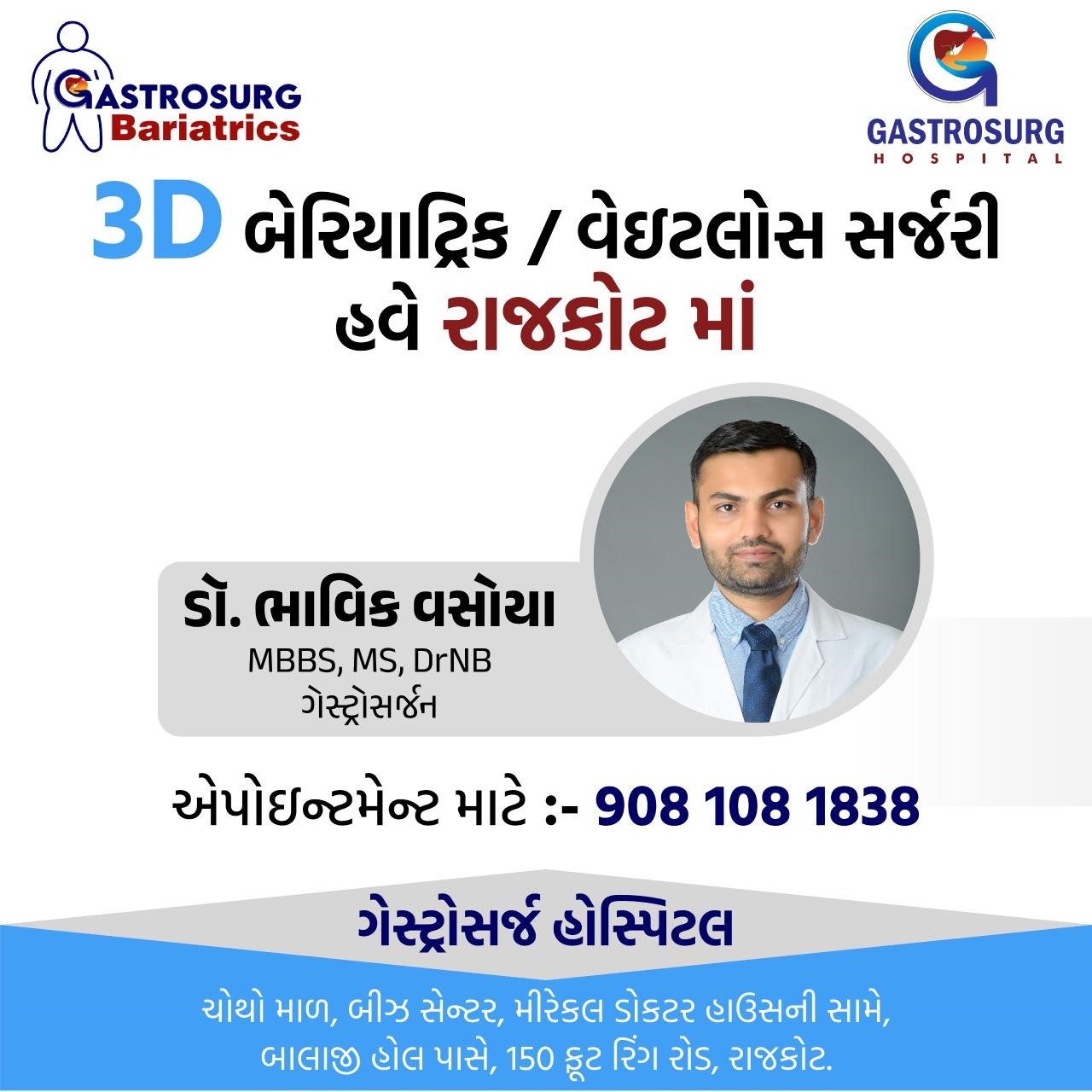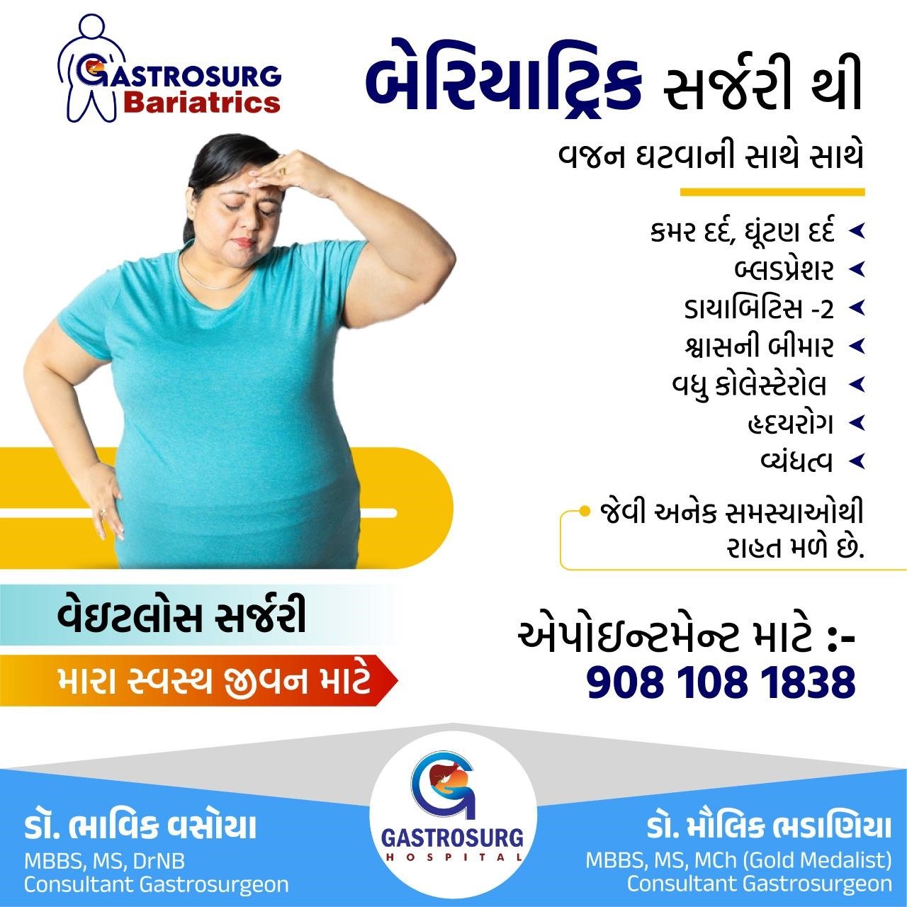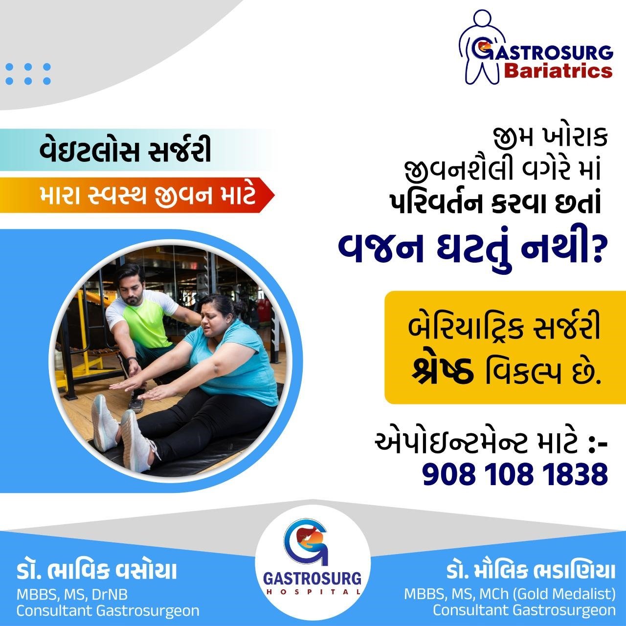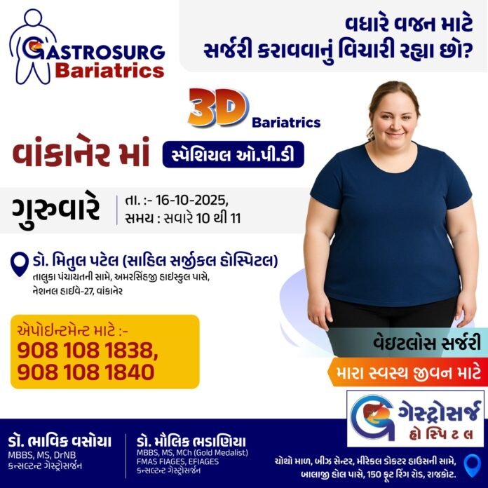 ડો. મિતુલ પટેલના દવાખાને વધારે વજન ધરાવતા લોકોને સર્જરી થકી વજન ઉતારવા માટે રાજકોટના સ્પેશ્યાલિસ્ટ ડોક્ટરની ઓપીડી યોજાશે….