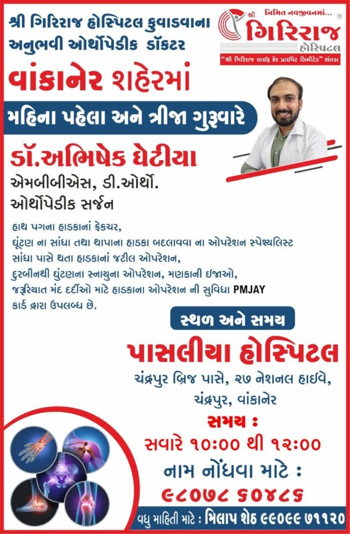 આવતીકાલે વાંકાનેરની પાસલીયા હોસ્પિટલ ખાતે રાજકોટની નામાંકિત ગિરિરાજ હોસ્પિટલના નિષ્ણાત ઓર્થોપેડીક સર્જન ડોક્ટરની ખાસ ઓપીડી યોજાશે….
