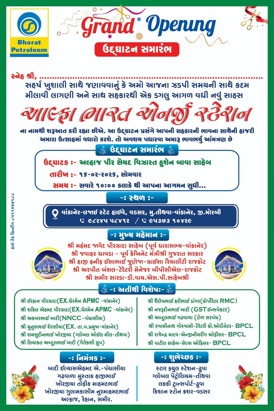 વાંકાનેર-લજાઇ રોડ પર વડસર નજીક આવતીકાલે ભારત પેટ્રોલિયમ કોર્પોરેશન લી. ના નવા પેટ્રોલ પંપ એવા આલ્ફા ભારત એનર્જી સ્ટેશનનો શુભારંભ થવા જઈ રહ્યો છે, ત્યારે આ ખુશીના પ્રસંગે તમામ સ્નેહીજનોને પધારવા આલ્ફા ભારત એનર્જી સ્ટેશન તરફથી ભાવભર્યું આમંત્રણ આપવામાં આવ્યું છે….