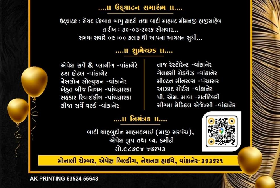વાંકાનેર શહેર નજીક નેશનલ હાઈવે પર પર મોનાલી ચેમ્બર ખાતે શ્રી એપેક્ષ ક્રેડીટ કો-ઓપરેટીવ સોસાયટી લિમિટેડનો આવતીકાલે સોમવારે ભવ્ય શુભારંભ થવા જઇ રહ્યો છે, ત્યારે આ પ્રસંગે હાજરી આપવા તમામ સ્નેહીજનોને ભાવભર્યું આમંત્રણ આપવામાં આવ્યું છે….