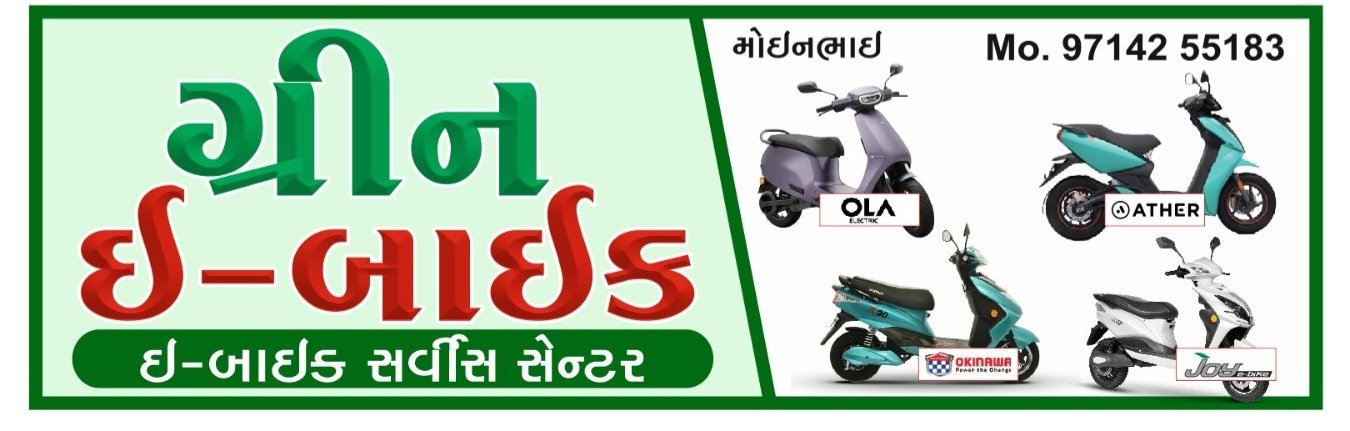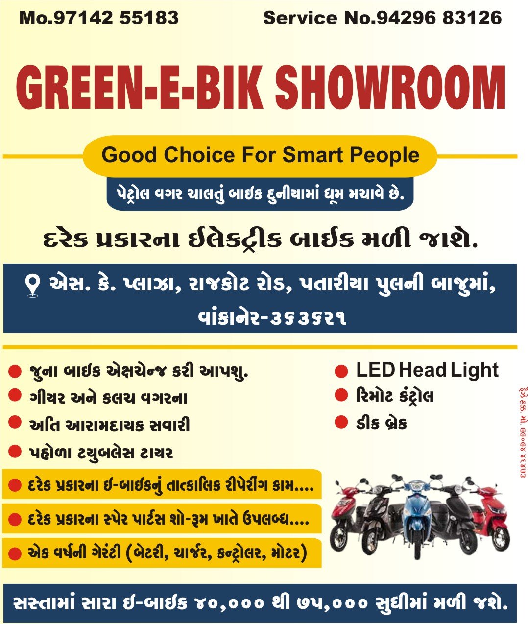 વાંકાનેર શહેરમાં Ola, Ether, Okinawa, Prakriti, 91 E-Bike સહિત દેશની દરેક નામાંકિત ઈ-બાઇક કંપનીઓના વિશાળ શો-રૂમ તથા જુના ઇ-બાઇક રીપેરીંગના સર્વિસ સેન્ટર એવા ગ્રીન ઇ-બાઇક દ્વારા નવા વર્ષના પ્રારંભ સાથે જ પોતાના ગ્રાહકો માટે ધમાકેદાર ઓફર લોન્ચ કરવામાં આવી છે, જેમાં ૧૦૦% વોટર પ્રૂફ 05 ઇ-બાઇકની ખરીદી પર એક ઇ-બાઇક બિલકુલ ફ્રીમાં આપવામાં આવશે, જેથી આપના મિત્ર સર્કલ સાથે ઇ-બાઇકની ખરીદી તથા ટેસ્ટ ડ્રાઈવ માટે આજે જ પધારો….