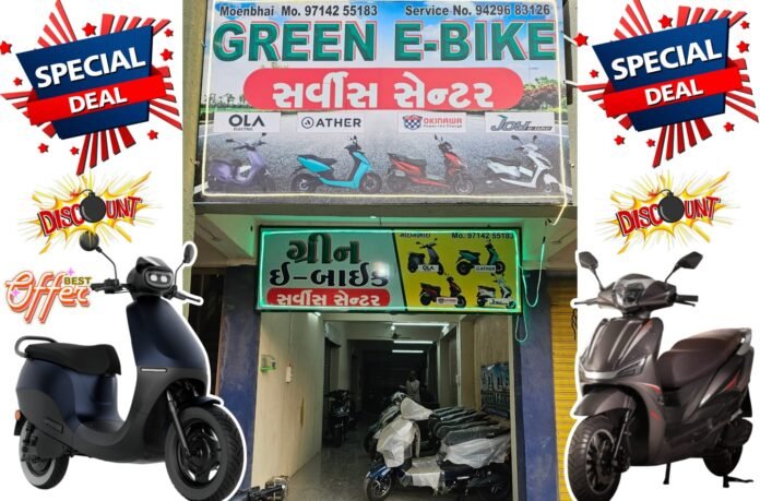 વાંકાનેર શહેરમાં સૌપ્રથમ વખત Ola, Ether, Okinawa, Prakriti, 91 E-Bike સહિત દેશની દરેક નામાંકિત ઈ-બાઇક કંપનીઓના નવા ઈ-બાઈકના શો-રૂમ તથા જુના ઇ-બાઇક રીપેરીંગના સૌપ્રથમ સર્વિસ સેન્ટર એવા ગ્રીન ઇ-બાઇક શોરૂમનો પ્રારંભ થઇ ચૂક્યો છે, જ્યાં હાલ ચાલતી તહેવારોની સીઝન દરમિયાન દરેક ઇ-બાઇકની ખરીદી પર ગ્રાહકોને સ્પેશિયલ ડિસ્કાઉન્ટ સાથે શ્યોર ગિફ્ટ બિલકુલ ફ્રી આપવામાં આવી રહી છે…