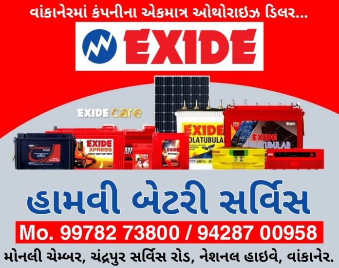 વાંકાનેર વિસ્તારમાં Exide કંપનીના એકમાત્ર ઓથોરાઇઝ ડિલર હામવી બેટરી ખાતેથી ખરીદો દરેક પ્રકારની બેટરી આકર્ષક ડિસ્કાઉન્ટ તેમજ સર્વશ્રેષ્ઠ સર્વિસ સાથે…‌.