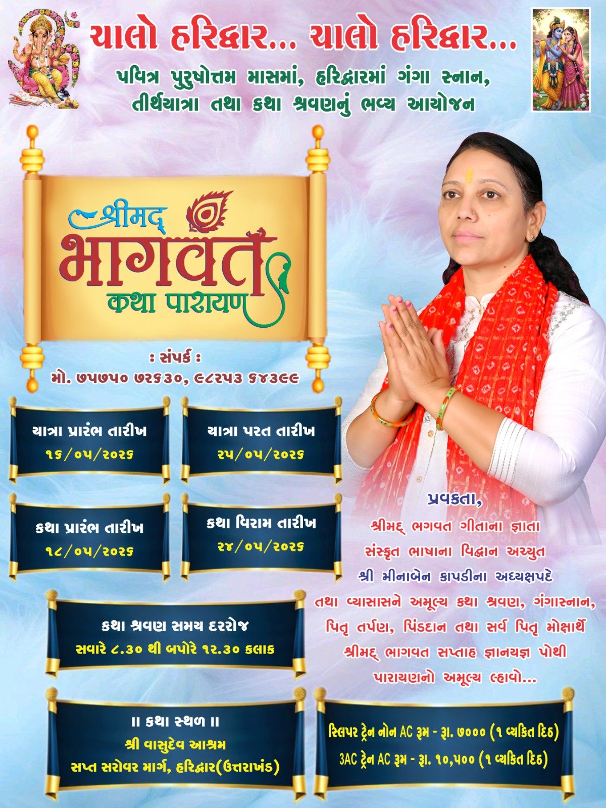 વાંકાનેરના વિદ્વાન વક્તા શ્રી મીનાબેન કાપડી સાથે આગામી મે મહિનામાં હરિદ્વાર ખાતે ભવ્ય શ્રીમદ્ ભાગવત કથા પારાયણનું આયોજન તા. ૧૮/૦૫ થી ૨૪/૦૫ દરમિયાન શ્રી વાસુદેવ આશ્રમ, સપ્ત સરોવર માર્ગ, હરિદ્વાર (ઉત્તરાખંડ) ખાતે કરવામાં આવ્યું હોય, જેથી આ સુંદર તીર્થયાત્રા તથા કથા શ્રવણનો લ્હાવો લેવા માટે તમામ શ્રદ્ધાળુઓને અપિલ કરવામાં આવી છે….
