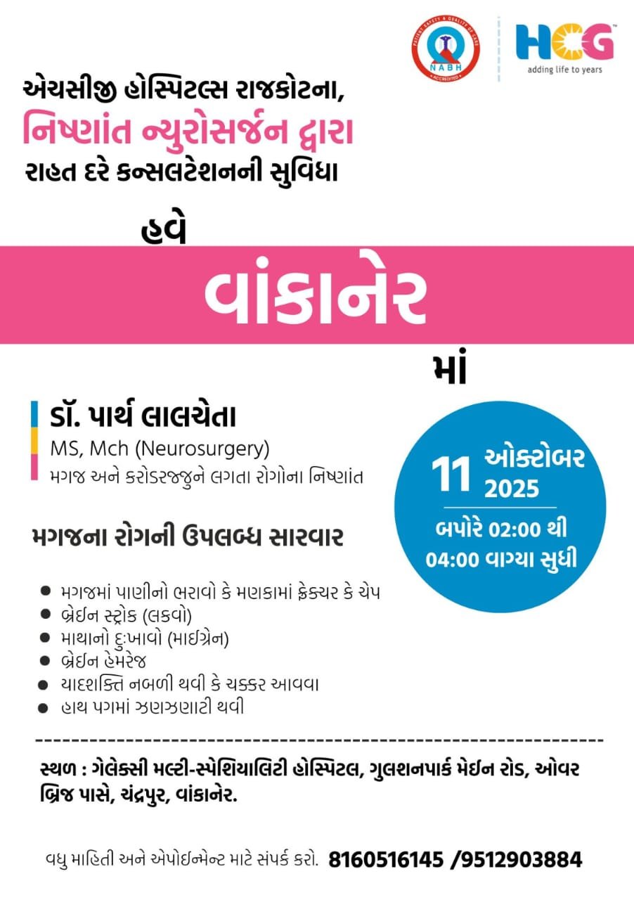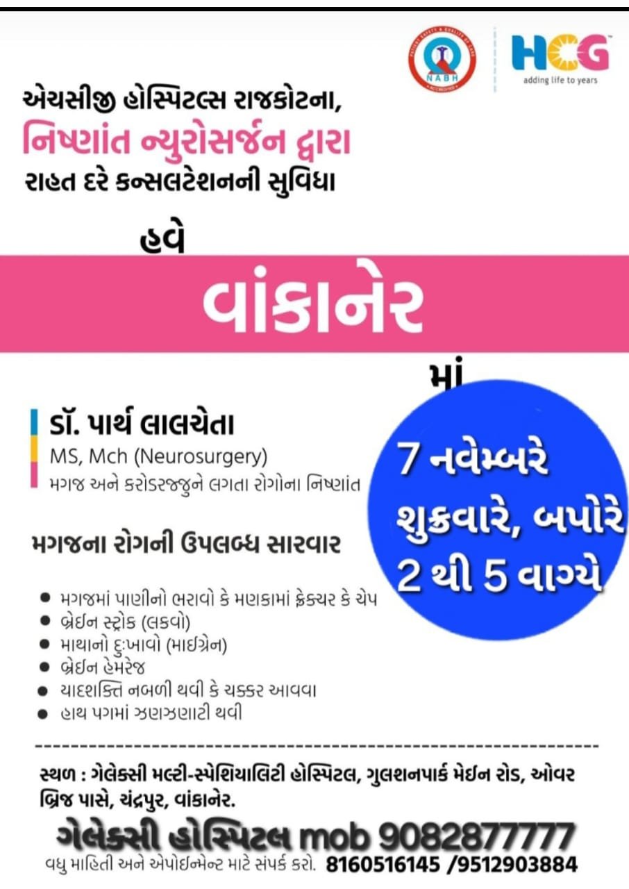 વાંકાનેરની ગેલેક્સી મલ્ટી સ્પેશિયાલિટી હોસ્પિટલ ખાતે આવતીકાલ શુક્રવારે રાજકોટની નામાંકિત એચસીજી હોસ્પિટલના નિષ્ણાંત ન્યુરોસર્જન દ્વારા રાહત દરે ઓપીડીનું આયોજન કરવામાં આવ્યું હોય, જેમાં મગજ અને કરોડરજ્જુના નિષ્ણાત ડો. પાર્થ લાલચેતા (M.S, Mch, Neurosurgery) દ્વારા મગજને લગતા દરેક રોગોનું સચોટ નિદાન તથા સારવાર કરવામાં આવશે….