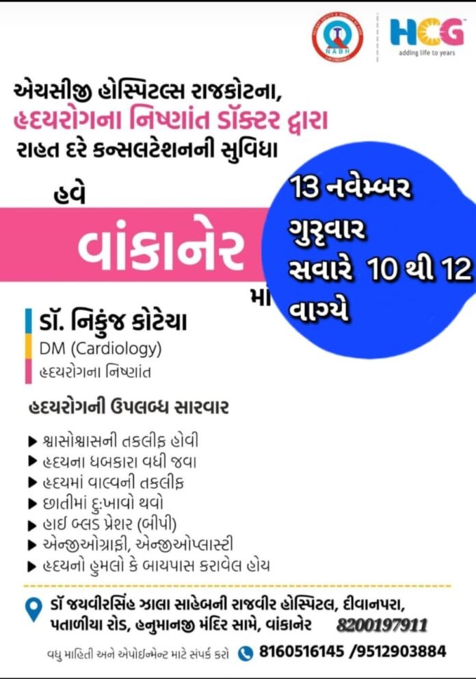 વાંકાનેર ખાતે ડો. જયવિરસિંહ ઝાલાની રાજવીર હોસ્પિટલ ખાતે આવતીકાલ તા. 13 નવેમ્બર, ગુરૂવારના રોજ રાજકોટની નામાંકિત એચસીજી હોસ્પિટલના હૃદય રોગના નિષ્ણાંત ડો. નિકુંજ કોટેચાની રાહત દરે કન્સલટેશન ઓપીડીનું આયોજન કરવામાં આવ્યું હોય, જેમાં દરેક પ્રકારના હૃદય રોગોનું સારવાર તથા સચોટ નિદાન કરવામાં આવશે, જેનો લાભ લેવા વાંકાનેર વિસ્તારના દર્દીઓને અનુરોધ કરાયો છે….