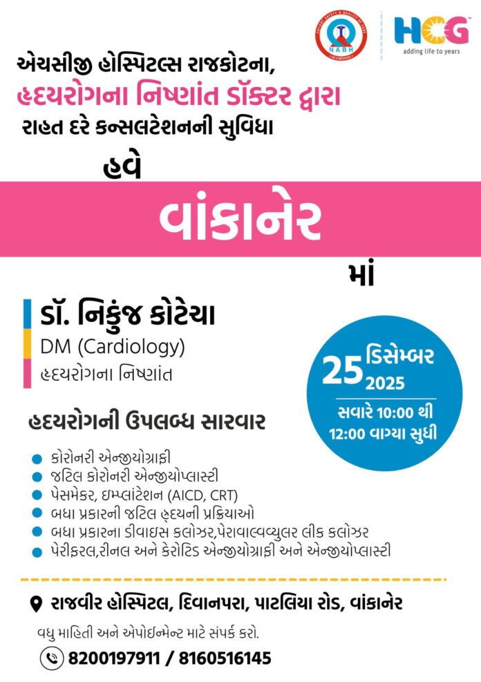 વાંકાનેર ખાતે ડો. જયવિરસિંહ ઝાલાની રાજવીર હોસ્પિટલ ખાતે આવતીકાલ તા. 25 ડિસેમ્બર, ગુરૂવારના રોજ રાજકોટની નામાંકિત એચસીજી હોસ્પિટલના હૃદય રોગના નિષ્ણાંત ડો. નિકુંજ કોટેચાની રાહત દરે કન્સલટેશન ઓપીડીનું આયોજન કરવામાં આવ્યું હોય, જેમાં દરેક પ્રકારના હૃદય રોગોનું સારવાર તથા સચોટ નિદાન કરવામાં આવશે, જેનો લાભ લેવા વાંકાનેર વિસ્તારના દર્દીઓને અનુરોધ કરાયો છે….