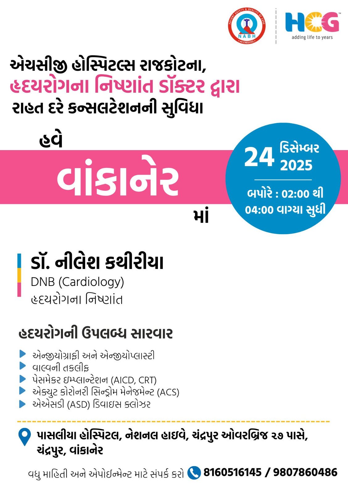 વાંકાનેરની પાસલીયા હોસ્પિટલ ખાતે આવતીકાલ તા. 24 ડિસેમ્બર, બુધવારના રોજ રાજકોટની નામાંકિત એચસીજી હોસ્પિટલના હૃદય રોગના નિષ્ણાંત ડો. નિલેશ કથીરીયાની રાહત દરે કન્સલટેશન ઓપીડીનું આયોજન કરવામાં આવ્યું હોય, જેમાં દરેક પ્રકારના હૃદય રોગોનું સારવાર તથા સચોટ નિદાન કરવામાં આવશે, જેનો લાભ લેવા વાંકાનેર વિસ્તારના દર્દીઓને અનુરોધ કરાયો છે….