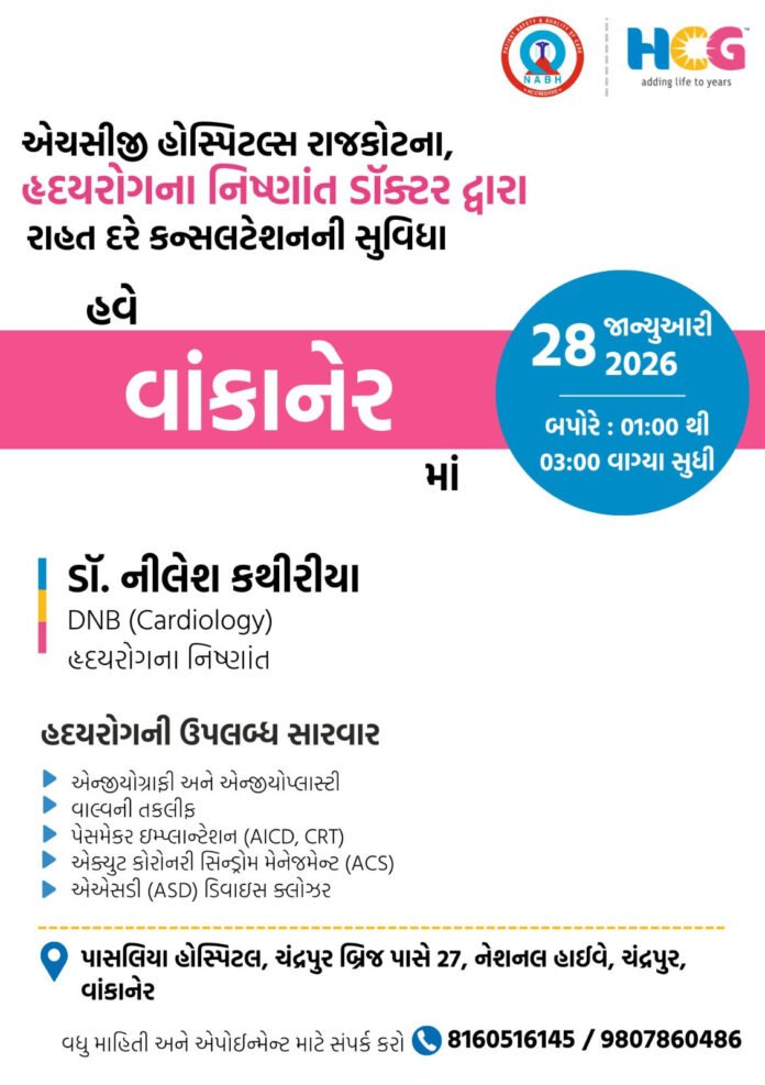 વાંકાનેરની પાસલીયા હોસ્પિટલ ખાતે આવતીકાલ તા. 28 જાન્યુઆરી, બુધવારના રોજ રાજકોટની નામાંકિત એચસીજી હોસ્પિટલના હૃદય રોગના નિષ્ણાંત ડો. નિલેશ કથીરીયાની રાહત દરે કન્સલટેશન ઓપીડીનું આયોજન કરવામાં આવ્યું હોય, જેમાં દરેક પ્રકારના હૃદય રોગોનું સારવાર તથા સચોટ નિદાન કરવામાં આવશે, જેનો લાભ લેવા વાંકાનેર વિસ્તારના દર્દીઓને અનુરોધ કરાયો છે….