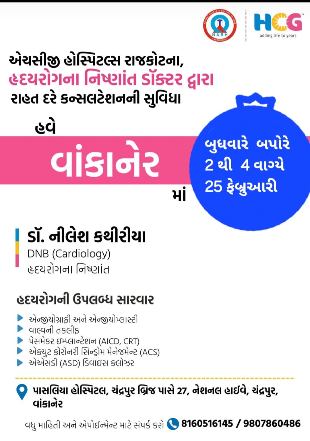 વાંકાનેરની પાસલીયા હોસ્પિટલ ખાતે આવતીકાલ તા. 25 ફેબ્રુઆરી, બુધવારના રોજ રાજકોટની નામાંકિત એચસીજી હોસ્પિટલના હૃદય રોગના નિષ્ણાંત ડો. નિલેશ કથીરીયાની રાહત દરે કન્સલટેશન ઓપીડીનું આયોજન કરવામાં આવ્યું હોય, જેમાં દરેક પ્રકારના હૃદય રોગોનું સારવાર તથા સચોટ નિદાન કરવામાં આવશે, જેનો લાભ લેવા વાંકાનેર વિસ્તારના દર્દીઓને અનુરોધ કરાયો છે….