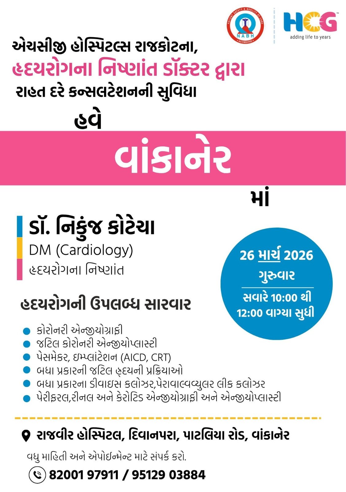 વાંકાનેર ખાતે ડો. જયવિરસિંહ ઝાલા સાહેબની રાજવીર હોસ્પિટલ ખાતે આવતીકાલ તા. 26 માર્ચ, ગુરૂવારના રોજ રાજકોટની નામાંકિત એચસીજી હોસ્પિટલના હૃદય રોગના નિષ્ણાંત ડો. નિકુંજ કોટેચાની રાહત દરે કન્સલટેશન ઓપીડીનું આયોજન કરવામાં આવ્યું હોય, જેમાં દરેક પ્રકારના હૃદય રોગોનું સારવાર તથા સચોટ નિદાન કરવામાં આવશે, જેનો લાભ લેવા વાંકાનેર વિસ્તારના દર્દીઓને અનુરોધ કરાયો છે….