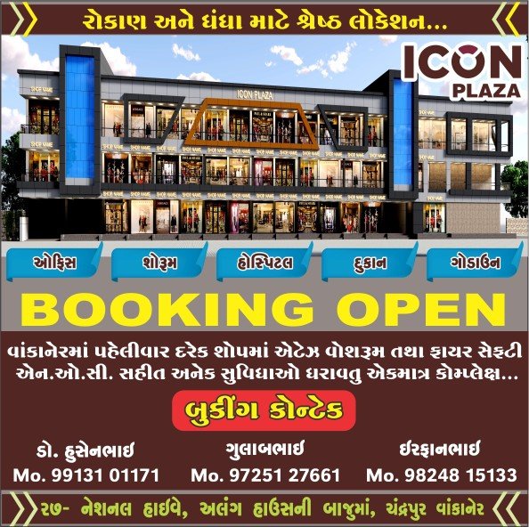 વાંકાનેર શહેરથી તદ્દન નજીક ૨૭-નેશનલ હાઈવે પર દરીયાલાલ જીનની સામે અત્યાધુનિક સુવિધાઓ સાથે નિર્માણ પામેલ આઇકોન પ્લાઝામાં જુજ માત્ર બાકી દુકાનો તથા ઓફિસ માટે બુકિંગ શરૂ કરવામાં આવ્યું છે, જેથી આપના ધંધા-રોજગારના વિકાસ તેમજ રોકાણના શ્રેષ્ઠ રિટર્ન મેળવવા માટે આજે જ નિચે આપેલ નંબર પર સંપર્ક કરવો….
