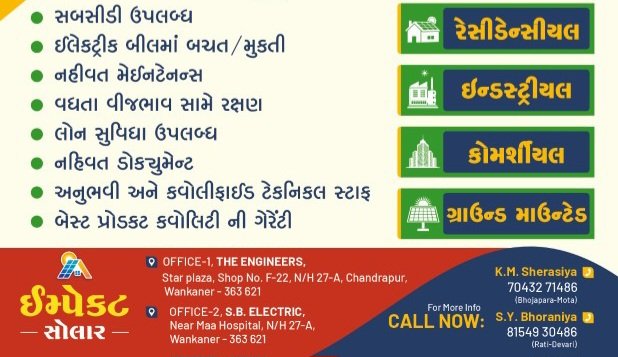 લિમિટેડ ઓફરનો લાભ લેવા આજે જ અમારો સંપર્ક કરો…: સોલાર રૂફટોપ સિસ્ટમ સાથે મેળવો ફ્રી સર્વિસ, ફ્રી ઇન્સ્ટોલેશન અને ફ્રી સાઇટ વિઝીટ…