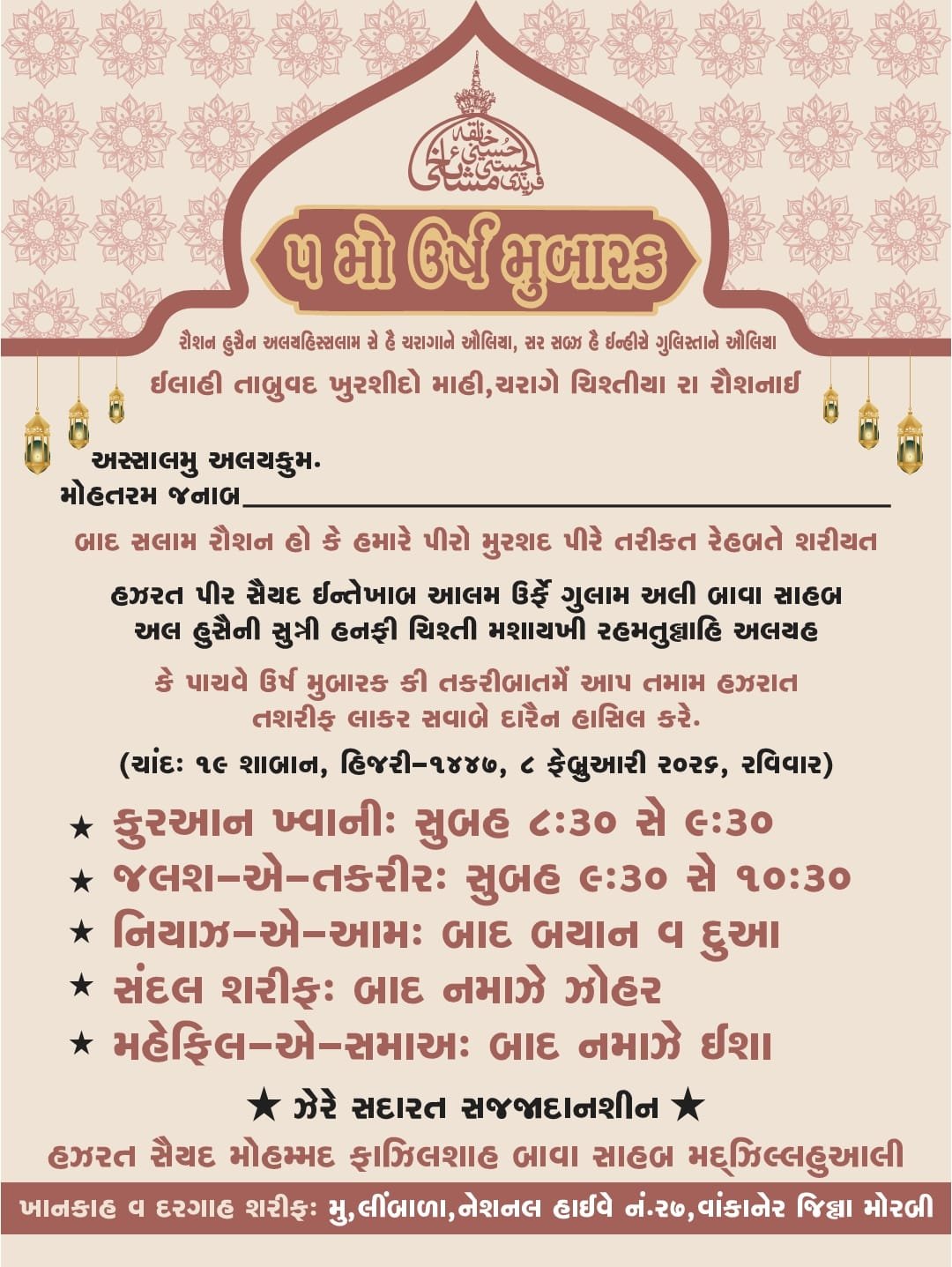 આ પાંચમાં ઉર્ષ મુબારક પ્રસંગે તમામ મુરીદિન તથા અકીદતમંદોએ હાજરી આપી સવાબે દારયન હાસિલ કરવા સજ્જાદાનશીન હઝરત પીર સૈયદ મોહમ્મદ ફાઝિલશાહબાવા સાહેબ મદ્દઝિલ્લહુલઆલી અને દરગાહ કમિટી તરફથી જાહેર આમંત્રણ આપવામાં આવ્યું છે….