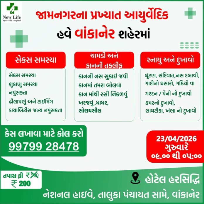 વાંકાનેર શહેરની હરસિદ્ધિ હોટલ ખાતે આવતીકાલ તા. 23 એપ્રિલ, ગુરૂવારના રોજ સવારે 9 થી સાંજે 7 સુધી આ કેમ્પ યોજાશે, જેમાં સેક્સ, શીઘ્રપતન, શુક્રાણુ સમસ્યા, કાનના વિવિધ રોગો, શરીરના કોઈ પણ દુઃખાવા તથા ચામડીના રોગ બાબતે સહિતની સેક્સની કોઈ પણ સમસ્યાની સારવાર જામનગરના આયુર્વેદ ડોક્ટર દ્વારા કરવામા આવશે….
