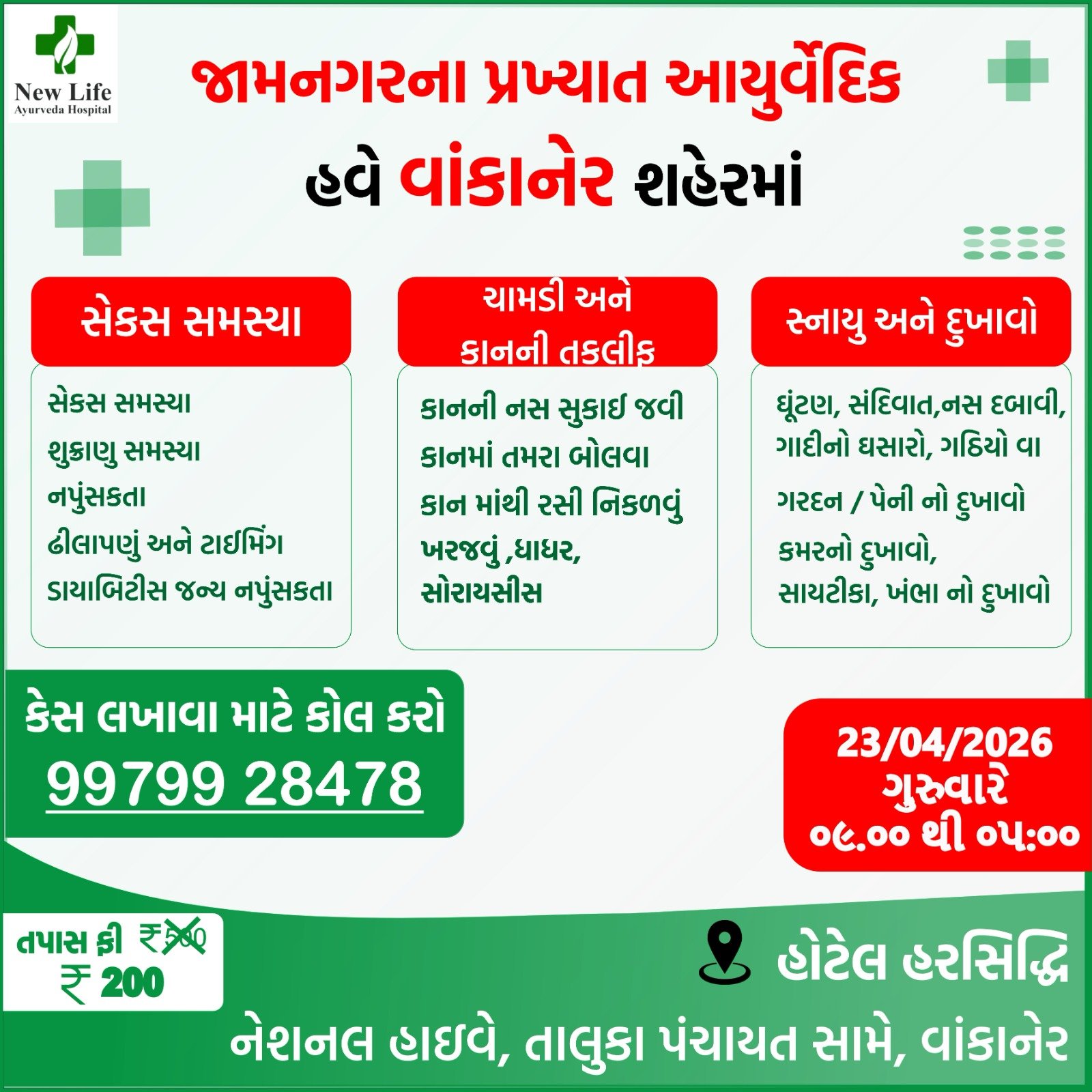 આજકાલના આધુનિક યુગમાં લાઈફ સ્ટાઇલમાં ફેરફાર થવાની સાથે અનેક શારિરીક સમસ્યાઓ વધી રહી છે, જેમાં પણ ખાસ ગુપ્ત રોગોનું પ્રમાણ વધી રહ્યું છે, જેથી આવી સમસ્યાઓમાં લોકો શેહ-શરમ મુકી સારવાર કરાવે તે અનિવાર્ય બન્યું છે. ત્યારે આપણા વાંકાનેર શહેર ખાતે જામનગરના નિષ્ણાત આયુર્વેદિક ડોક્ટર દ્વારા ગુપ્તરોગો, કાનના રોગો, શરીરના દુખાવા તથા ચામડીના રોગ માટે ઓપીડી/નિદાન કેમ્પનું આયોજન કરવામાં આવ્યું છે, જેમાં જામનગરના પ્રખ્યાત ડોક્ટર દ્વારા ગુપ્તરોગો, સેક્સ સમસ્યા, કાનના વિવિધ રોગો, શરીરના કોઈ પણ દુઃખાવા તથા ચામડીના રોગ બાબતે આયુર્વેદિક પદ્ધતિથી સારવાર કરવામાં આવશે….