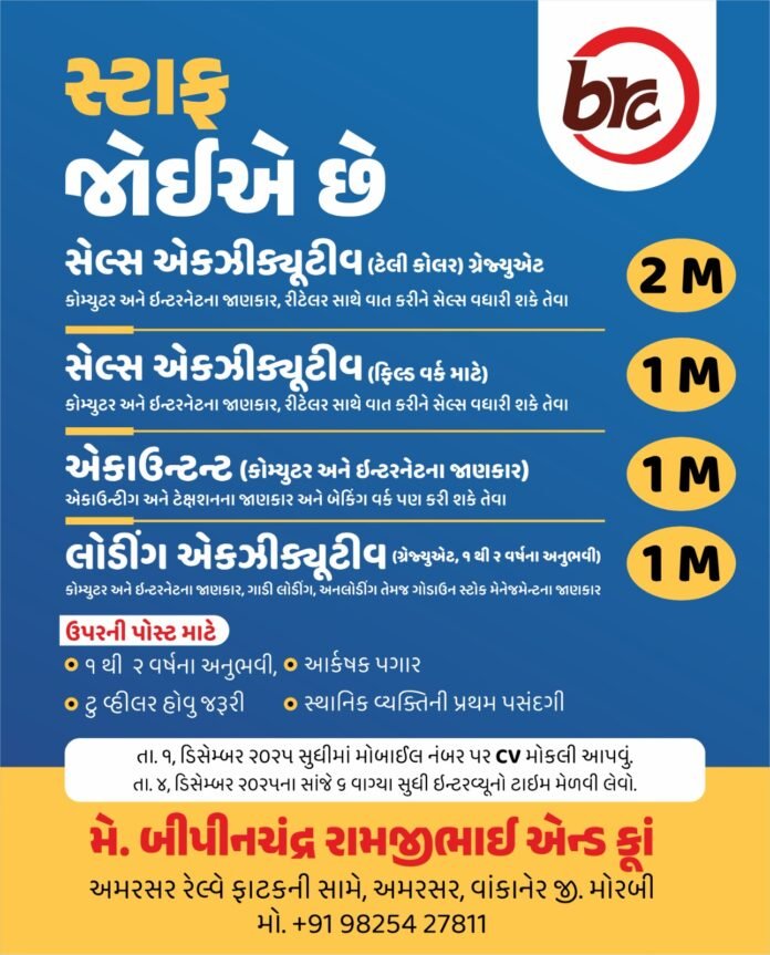 વાંકાનેર પંથકની નામાંકિત અને અગ્રગણ્ય વેપારી પેઢી એવી મે. બીપીનચંદ્ર રામજીભાઈ એન્ડ કંપની ખાતે તાત્કાલિક ધોરણે વિવિધ જગ્યાઓ પર આકર્ષક પગાર ધોરણ સાથે સ્ટાફની ભરતી કરવાની હોય, જેથી રસ ધરાવતા ઉમેદવારોએ આગામી તા. 01 ડિસેમ્બર સુધીમાં પોતાનું રિઝ્યુમ(CV) નિચે આપેલ નંબર પર વોટ્સએપ કરવાનું રહેશે…