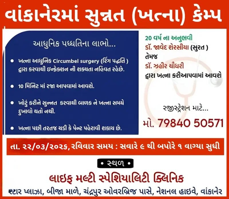 વાંકાનેર શહેરની લાઇફ મલ્ટી સ્પેશ્યાલિટી ક્લિનિક ખાતે આગામી રવિવાર તા. 22 માર્ચ, રવિવારના રોજ બાળકોમાં સુન્નત (ખત્ના) માટે ખાસ કેમ્પનું આયોજન કરવામાં આવ્યું છે, જેમાં સુરતના 22 કરતા વધુ વર્ષોના અનુભવી ડો. જાવેદ શેરસીયા અને ડો. ઝહીર ચૌધરી દ્વારા આધુનિક પદ્ધતિથી સુન્નત (ખત્ના) કરવામાં આવશે, જેથી આ કેમ્પનો લાભ લેવા ઇચ્છતા લોકોએ નીચે આપેલ નંબર પર રજીસ્ટ્રેશન કરાવવાનું રહેશે….
