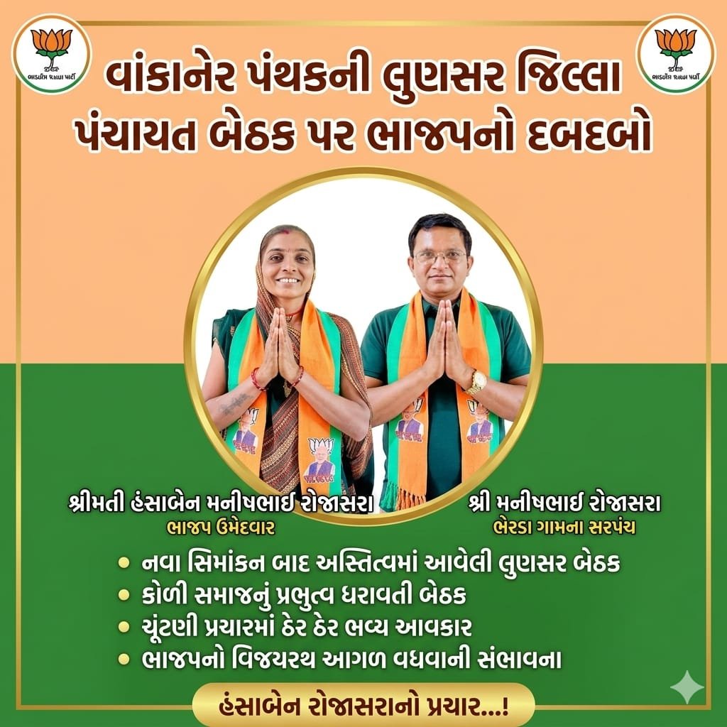 તાજેતરમાં થયેલા નવા સિમાંકનને કારણે લુણસર બેઠક નવી જ રીતે અસ્તિત્વમાં આવી છે. આ બેઠક પર કબ્જો જમાવવા અને વિકાસના કામોને આગળ વધારવા માટે ભાજપે ભેરડા ગામના અત્યંત લોકપ્રિય અને જમીન સાથે જોડાયેલા સરપંચ મનિષભાઈ રોજાસરા પર વિશ્વાસ વ્યક્ત કર્યો છે. પક્ષ દ્વારા મનિષભાઈ રોજાસરાના ધર્મપત્ની હંસાબેન રોજાસરાને સત્તાવાર રીતે ઉમેદવાર બનાવવામાં આવ્યા છે. મનિષભાઈની સ્થાનિક સ્તરે સતત સક્રિયતા અને લોકચાહનાનો સીધો ફાયદો તેમના પત્નીને ચૂંટણીમાં મળી રહ્યો છે….