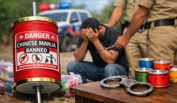 ચાઈનીઝ માંજોનો ઉપયોગ માનવજીવન તથા પક્ષીઓ માટે જોખમકારક હોવાથી તેના વેચાણ અને ઉપયોગ પર પ્રતિબંધ હોવા છતાં આવી હરકત કરવામાં આવતા તંત્ર દ્વારા કડક કાર્યવાહી હાથ ધરવામાં આવી છે.‌.