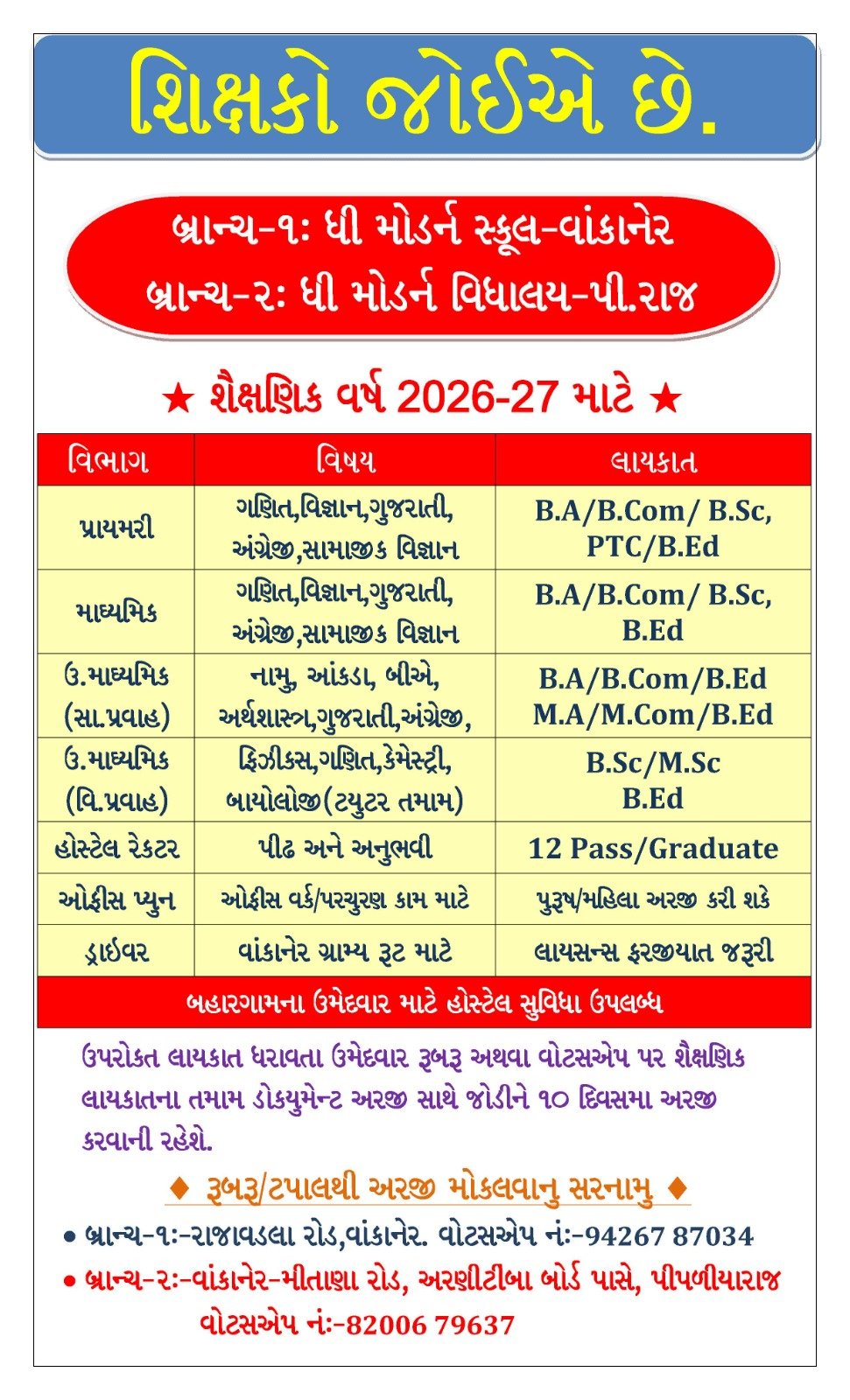 વાંકાનેર વિસ્તારમાં નામાંકિત એવી ધી મોડર્ન સ્કૂલ-વાંકાનેર તથા ધી મોડર્ન વિદ્યાલય-પીપળીયા રાજ એમ બંને સંકુલમાં નવા શૈક્ષણિક વર્ષ ૨૦૨૬-૨૭ માટે ઉચ્ચત્તમ પગાર ધોરણથી શૈક્ષણિક તથા બિનશૈક્ષણિક સ્ટાફની ભરતી કરવાની હોય, જેથી નીચે મુજબની જગ્યાઓ પર યોગ્ય લાયકાત ધરાવતા ઉમેદવારોએ પોતાની અરજી તમામ ડોક્યુમેન્ટ સાથે રૂબરૂ સ્કૂલ પર અથવા વોટ્સએપ નંબર પર આગામી દસ દિવસમાં મોકલવાની રહેશે…