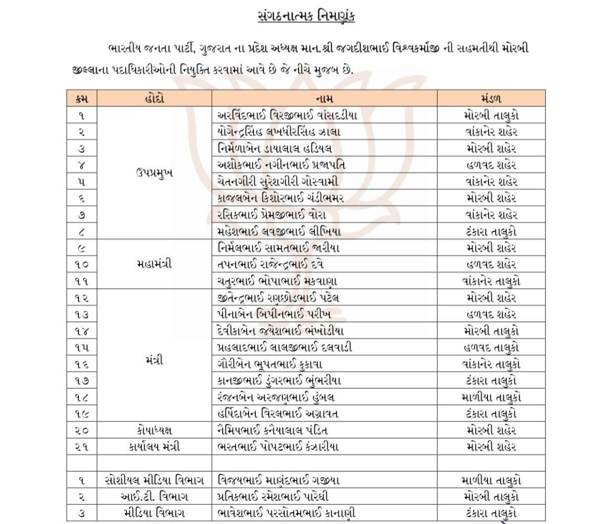 મોરબી જિલ્લા ભાજપ સંગઠનના નવા હોદ્દેદારો….