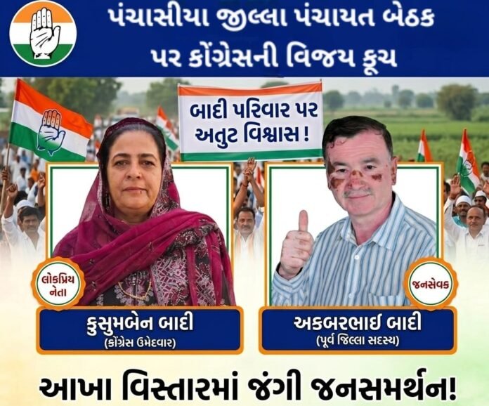 કુસુમબેન બાદીને મળી રહેલા આ બહુમત જનસમર્થન પાછળ તેમના પતિ અને સામાજિક અગ્રણી અકબરભાઈ બાદીની વર્ષોની નિસ્વાર્થ લોકસેવા સૌથી મોટું પરિબળ બની રહી છે. અકબરભાઈ હંમેશા લોકોના નાના-મોટા પ્રશ્નોનો તાગ મેળવીને તેને તાત્કાલિક ઉકેલવા માટે જાણીતા છે. તેઓ માત્ર ચૂંટણી પૂરતા જ નહીં, પરંતુ બારેમાસ લોકોના સુખ-દુઃખમાં પડખે ઊભા રહેતા નેતા છે. આ સેવાકીય કાર્યોનું ઋણ ચૂકવવા માટે હવે આખો વિસ્તાર એકજૂથ થયો છે અને “આપણો મત, આપણા સેવકને” તેવા નારા સાથે કુસુમબેન બાદીને વિજયી બનાવવા કટિબદ્ધ બન્યો છે. ચૂંટણી પ્રચાર અંતિમ તબક્કા તરફ પ્રયાણ કરી રહ્યો છે ત્યારે પંચાસીયા બેઠક પર કોંગ્રેસની ઐતિહાસિક જીત નિશ્ચિત મનાઈ રહી છે….