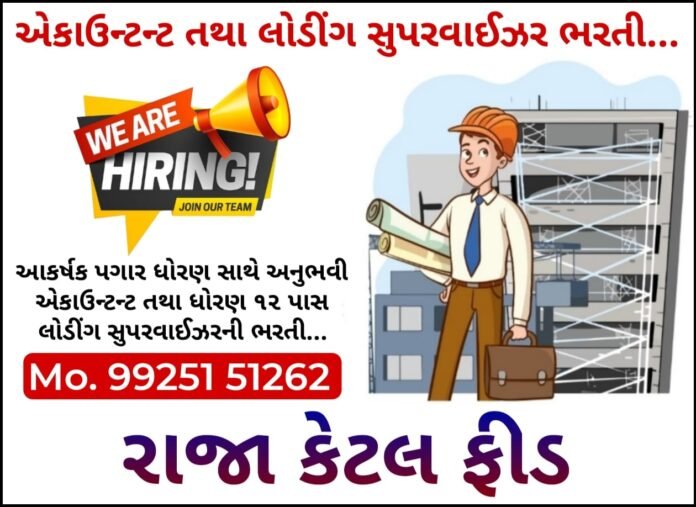 વાંકાનેર શહેર નજીક રાજાવડલા રોડ પર આવેલ રાજા કેટલ ફીડ નામના કારખાનામાં તાત્કાલિક ધોરણે આકર્ષક પગાર ધોરણ સાથે લોડીંગ સુપરવાઈઝર તથા એકાઉન્ટની ભરતી કરવાની હોય, જેથી રસ ધરાવતા ઉમેદવારોએ તાત્કાલિક નીચે આપેલ નંબર પર સંપર્ક કરવો….
