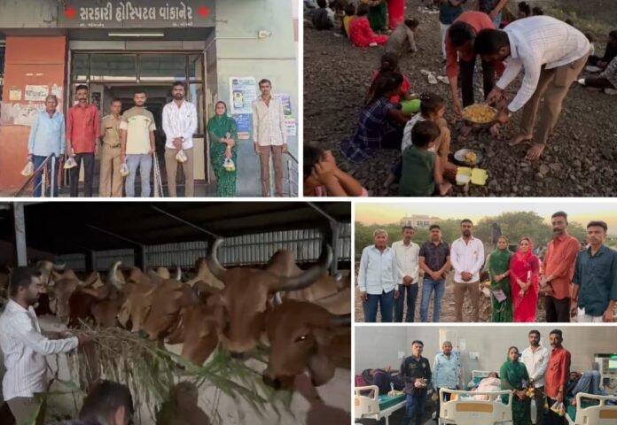 વાંકાનેર શહેર ખાતે બુધવારના રોજ વાંકાનેરના રાજવી અને રાજ્યસભા સાંસદ કેશરીદેવસિંહ ઝાલાના જન્મ દિવસની વાંકાનેર શહેર યુવા ભાજપ દ્વારા સેવામય ઉજવણી કરવામાં આવી હોય, જેમાં શહેર યુવા ભાજપ ટીમ દ્વારા વાંકાનેર સિવિલ હોસ્પિટલ ખાતે દર્દીઓને ફ્રુટ વિતરણ, અંધ અપંગ ગૌશાળા-રાજાવડલા ખાતે ગાયોને લીલો ઘાસચારો તેમજ શનિદેવ મંદિર ખાતે બાળકોને બટુક ભોજન કરાવાયુ હતું…