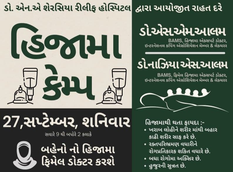 (નોંધ : આ હિજામા કેમ્પમાં ફાયર કપિંગ તથા મસાજ કપિંગ સાથે એક કપ/પોઇન્ટના ફક્ત રૂ. ૭૦/- ચાર્જ રહેશે, જેમાં બહેનો માટે અલગથી ફિમેલ ડોક્ટર દ્વારા સારવાર કરવામાં આવશે…)