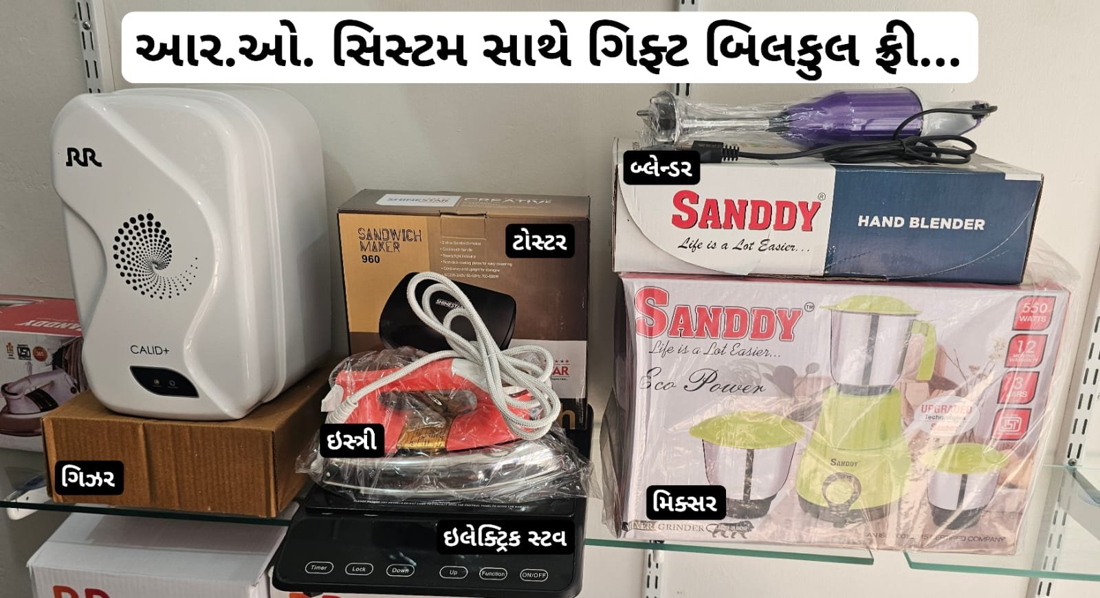 • આપની જરૂરિયાત અનુસાર આર.ઓ. પ્લાન્ટની ખરીદી પર મોડેલ મુજબ મિક્સર, ગિઝર, બ્લેન્ડર, ટોસ્ટર, ઇલેક્ટ્રિક સ્ટવ, ઇસ્ત્રી બિલકુલ ફ્રી….