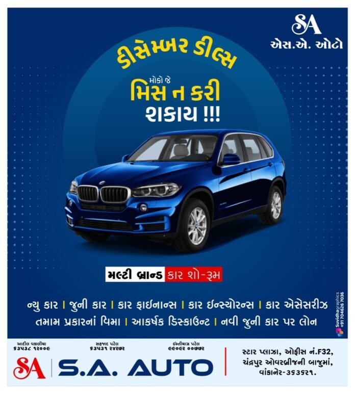 વાંકાનેર શહેર ખાતે સ્ટાર પ્લાઝામાં કાર્યરત એસ. એ. ઓટો દ્વારા વર્ષના અંતિમ તબક્કામાં કંપની પ્રોડક્શન સ્પેશ્યલ ડિસ્કાઉન્ટ ઓફરનો સીધો લાભ ગ્રાહકોને આપવા ડિસેમ્બર ડીલ્સ સ્પેશ્યલ ડિસ્કાઉન્ટ ઓફર જાહેર કરવામાં આવી છે, જેમાં નવા કોઇપણ ફોર વ્હીલર વાહનોના બુકિંગ પર શોરૂમ કરતા પણ વધારે ડિસ્કાઉન્ટ સાથે બુકિંગ શરૂ કરવામાં આવ્યા છે…