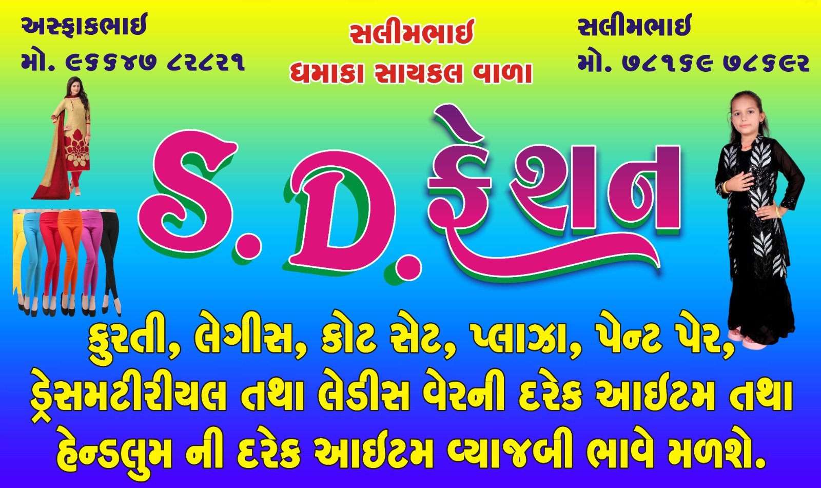 સલીમભાઈ મેમણના નવા શોરૂમ એસ. ડી. ફેશન ખાતેથી ગ્રાહકોને વર્ષોનાં વિશ્વાસ સાથે એકદમ વ્યાજબી દરેથી લેડિઝ વેર આઇટમોમાં કુર્તી, લેગીસ, કોટ સેટ, પ્લાઝા, પેન્ટ પેર, ડ્રેસ મટીરીયલ્સ તેમજ હેન્ડલૂમની દરેક આઇટમો તેમજ કિડ્સ વેર આઇટમો વિશાળ રેન્જ તદ્દન નવા સ્ટોક સાથે મળી રહેશે….